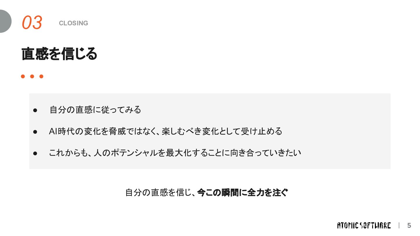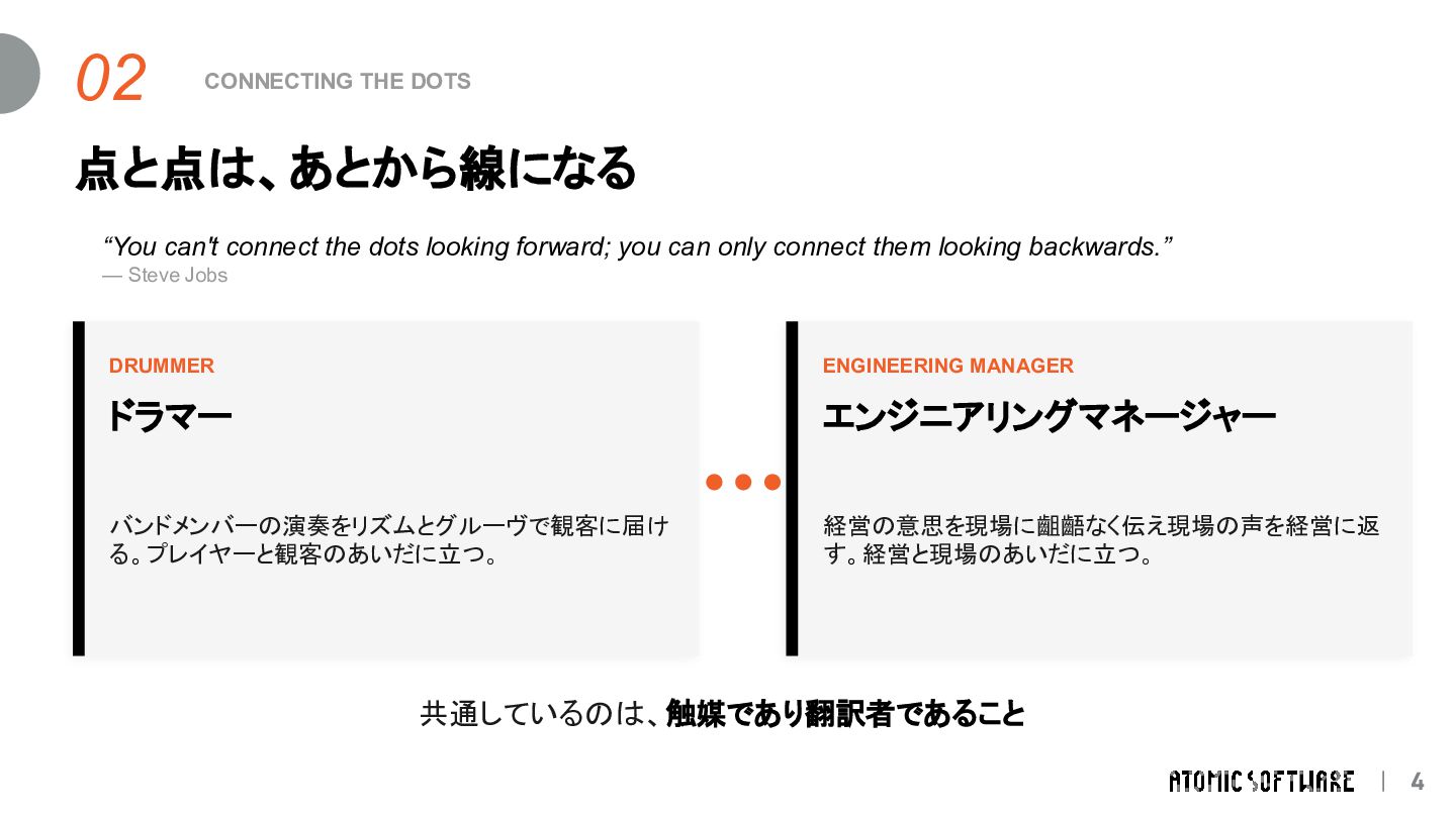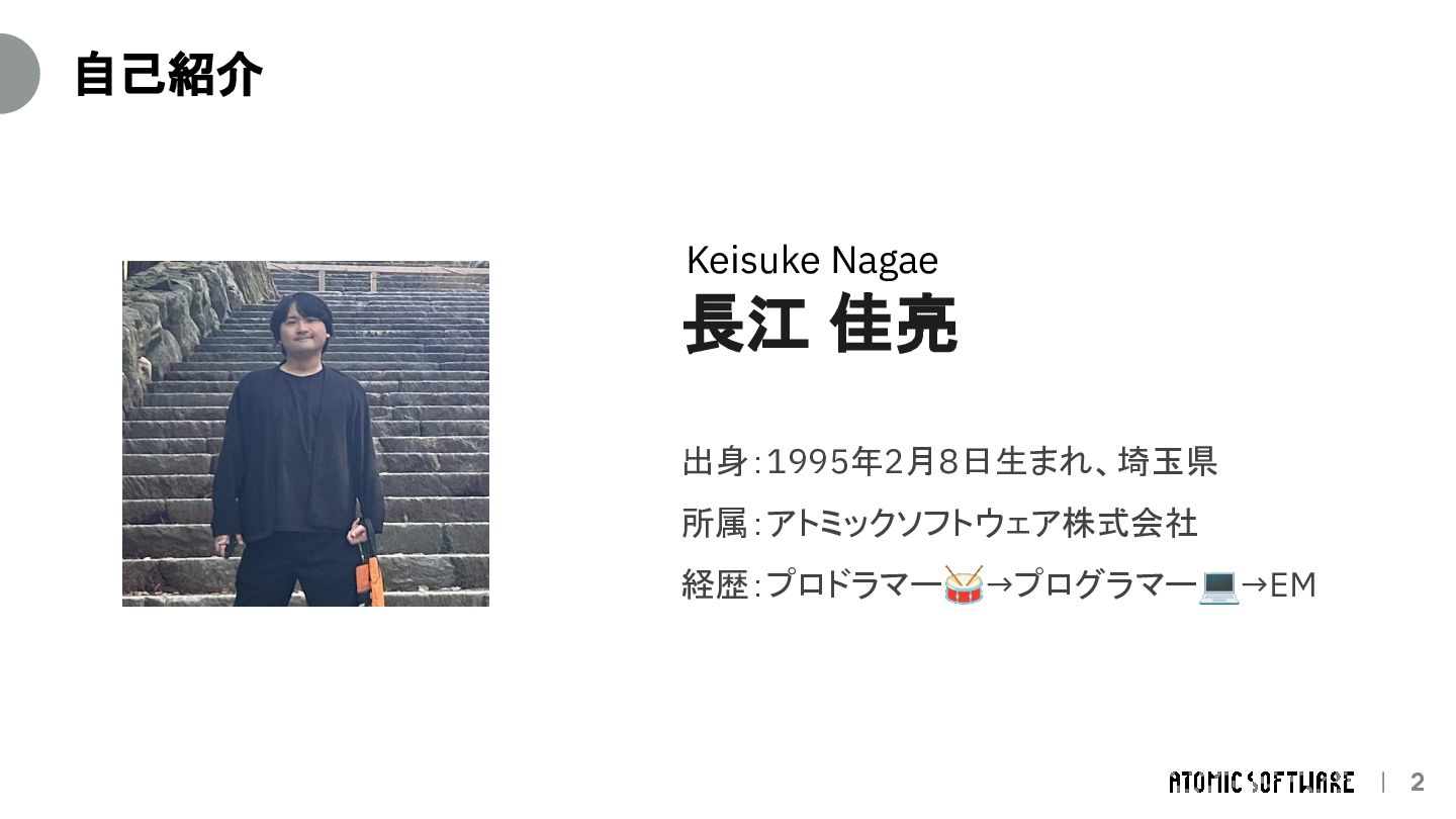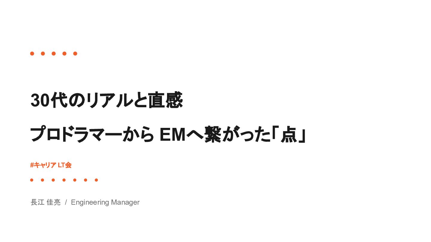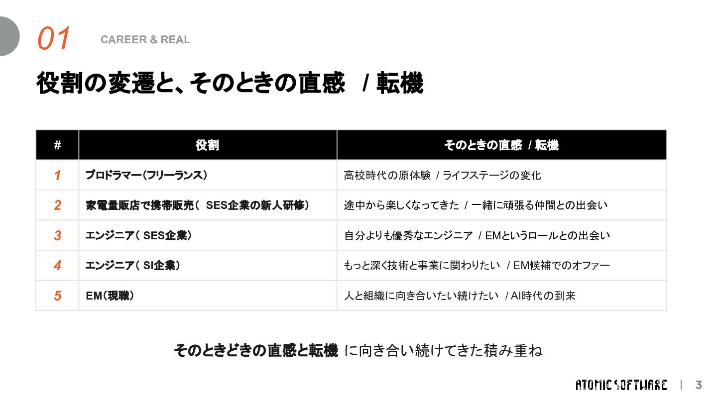 そのときの直感 / 転機 1 プロドラマー(フリーランス) 高校時代の原体験 / ライフステージの変化 2 家電量販店で携帯販売( SES企業の新人研修) 途中から楽しくなってきた / 一緒に頑張る仲間との出会い 3 エンジニア( SES企業) 自分よりも優秀なエンジニア / EMというロールとの出会い 4 エンジニア( SI企業) もっと深く技術と事業に関わりたい / EM候補でのオファー 5 EM(現職) 人と組織に向き合いたい続けたい / AI時代の到来 そのときどきの直感と転機 に向き合い続けてきた積み重ね