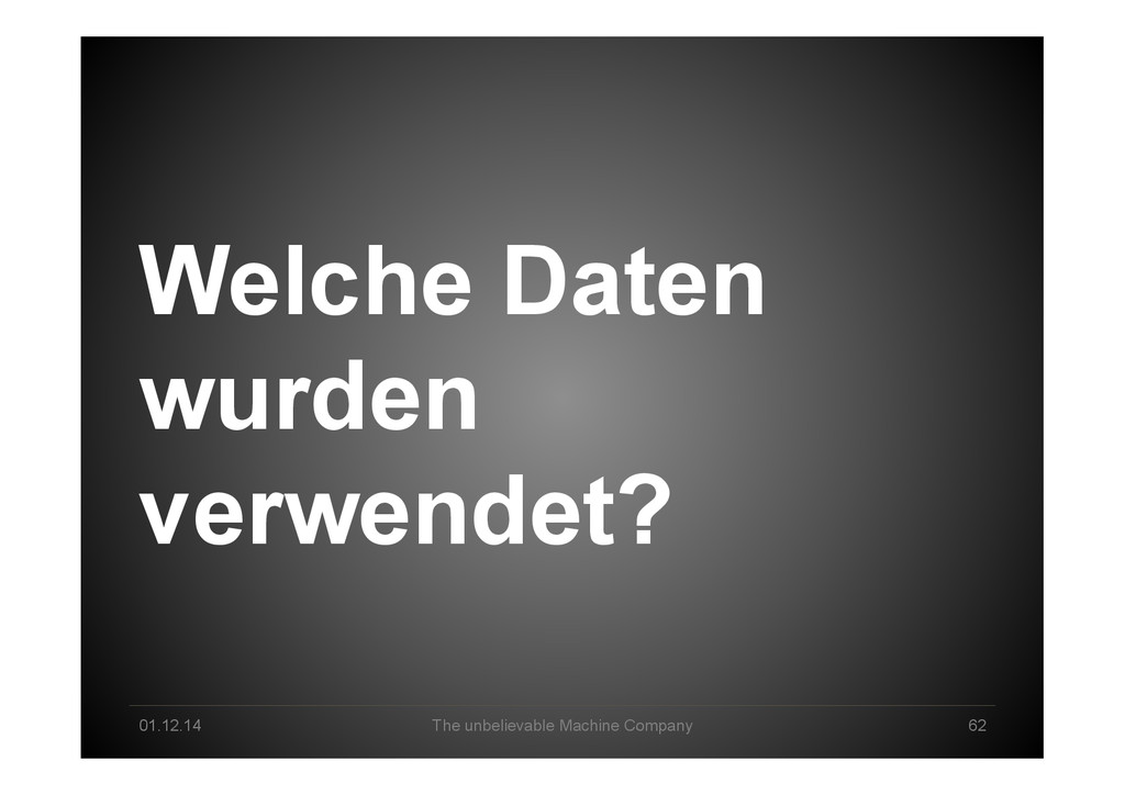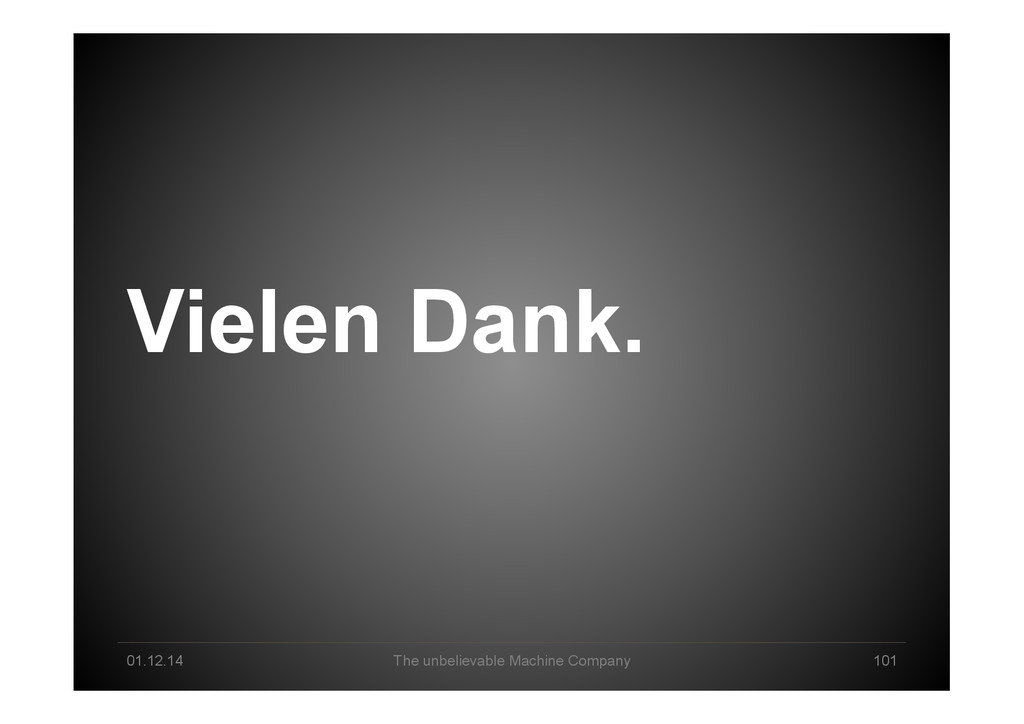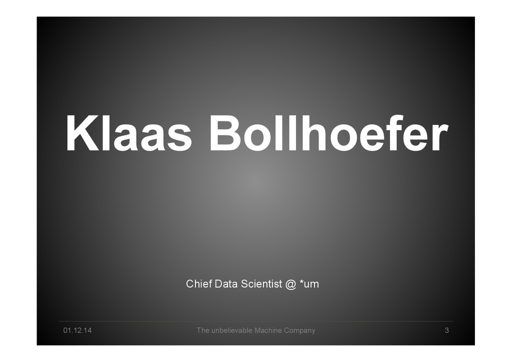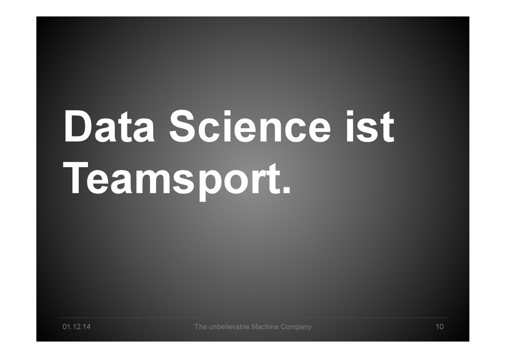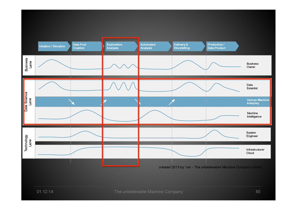 Pool Creation Explorative Analysis Automated Analysis Delivery & Storytelling Production / Data Product Business Owner Data Scientist Machine Intelligence Business Lane Data Science Lane System Engineer Infrastructure/ Cloud Technology Lane Human-Machine Interplay created 2013 by *um - The unbelievable Machine Company GmbH
