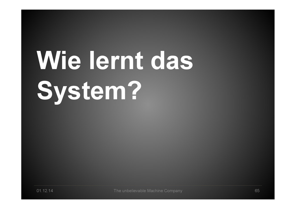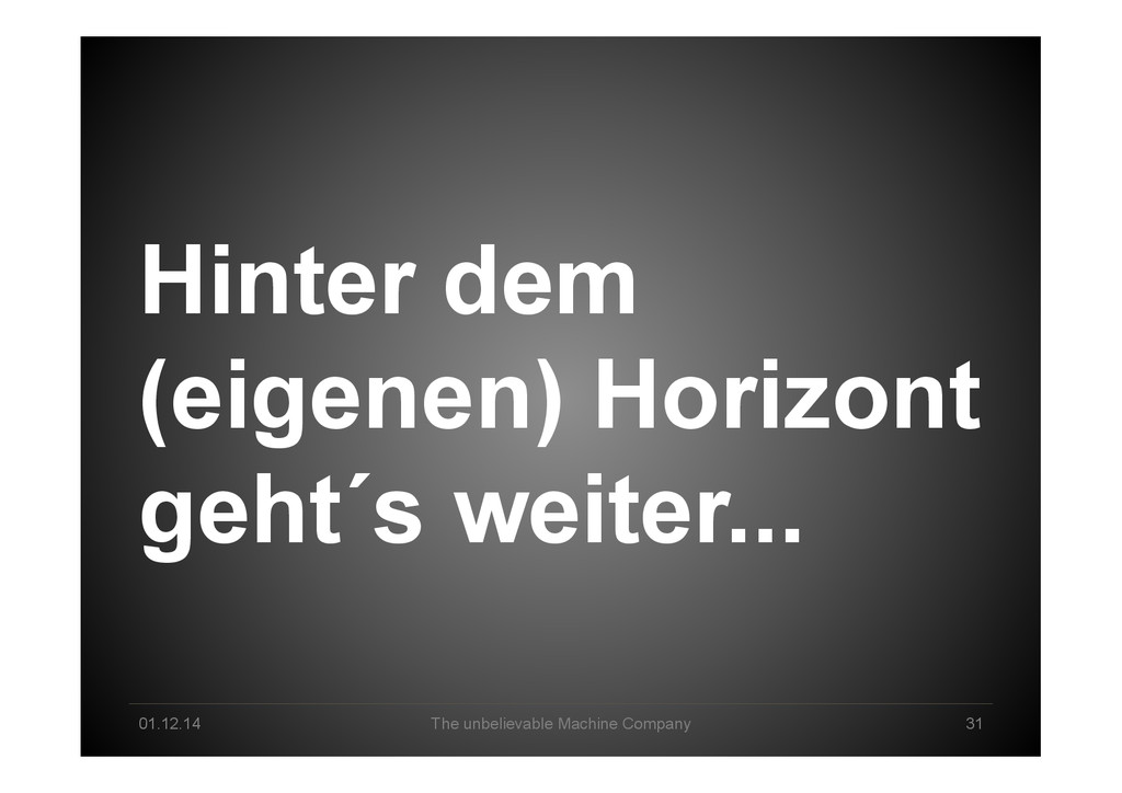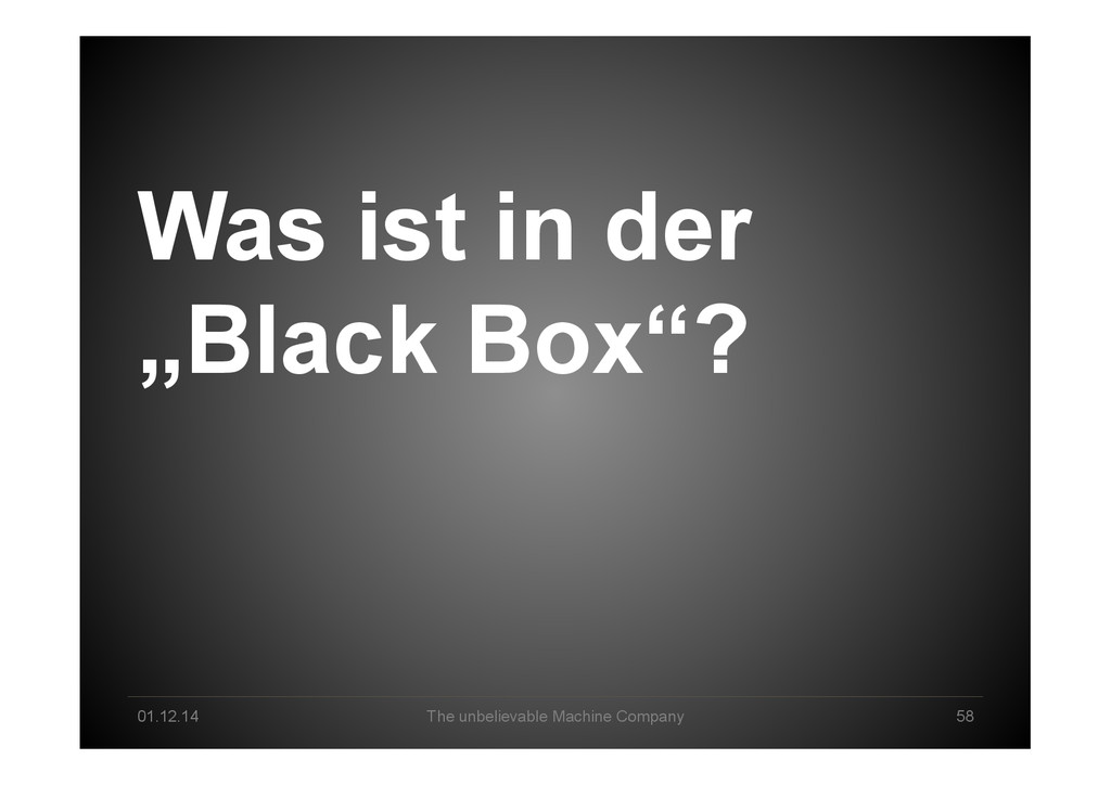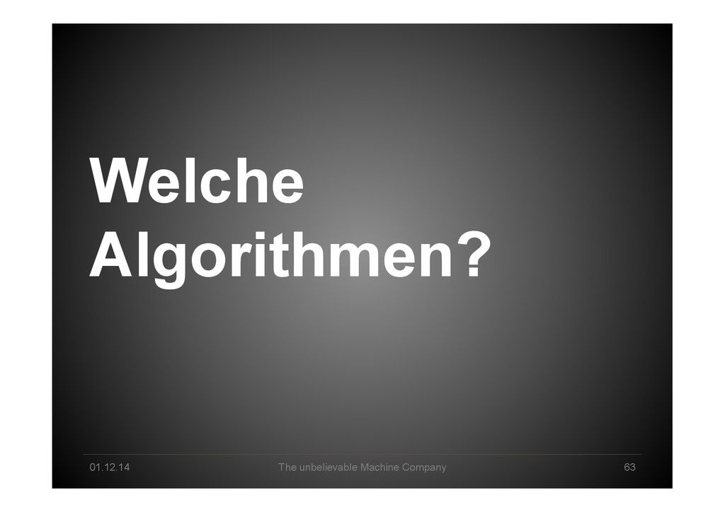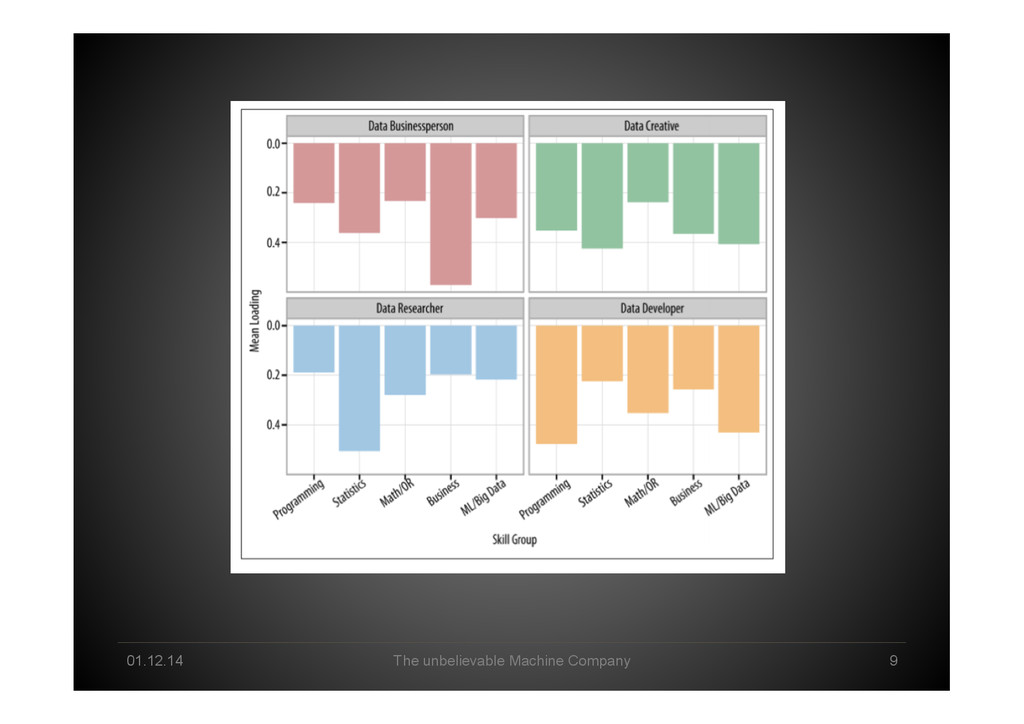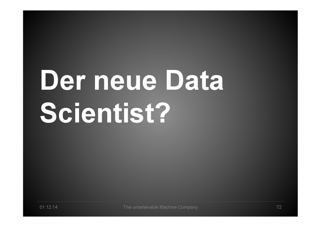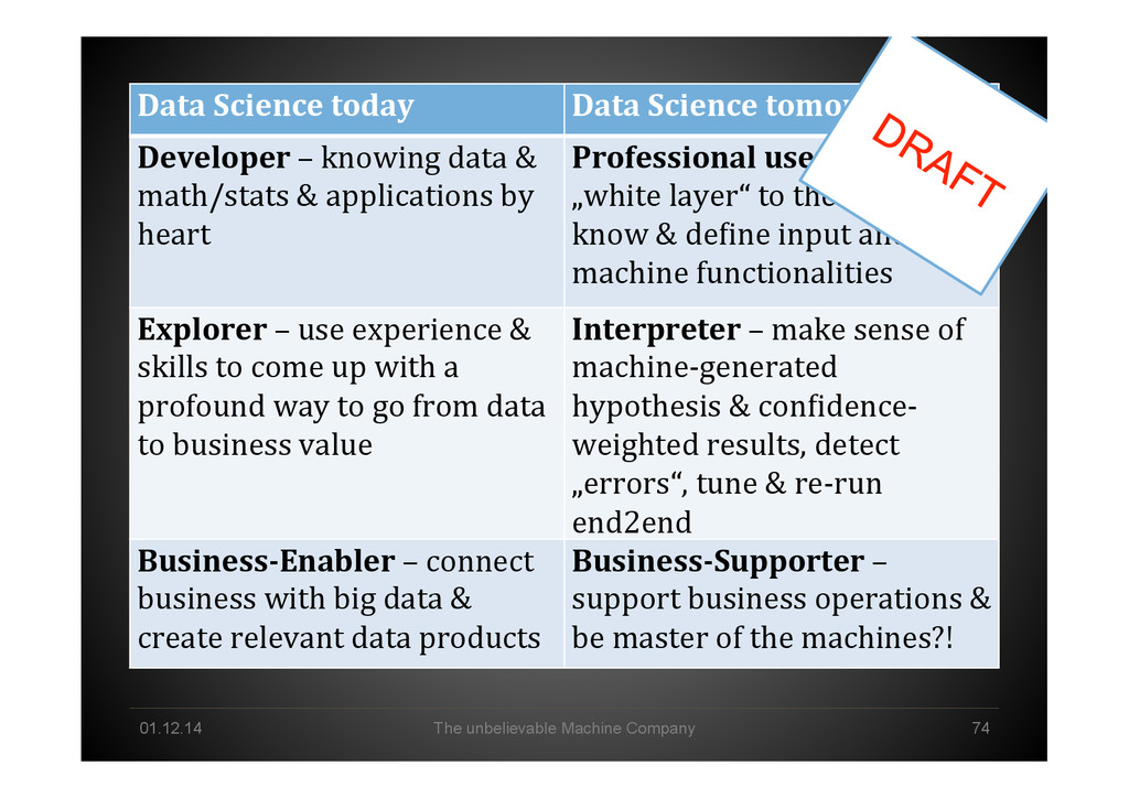 Data Science tomorrow Developer – knowing data & math/stats & applications by heart Professional user – act as a „white layer“ to the black box, know & de<ine input and machine functionalities Explorer – use experience & skills to come up with a profound way to go from data to business value Interpreter – make sense of machine-‐generated hypothesis & con<idence-‐ weighted results, detect „errors“, tune & re-‐run end2end Business-‐Enabler – connect business with big data & create relevant data products Business-‐Supporter – support business operations & be master of the machines?!