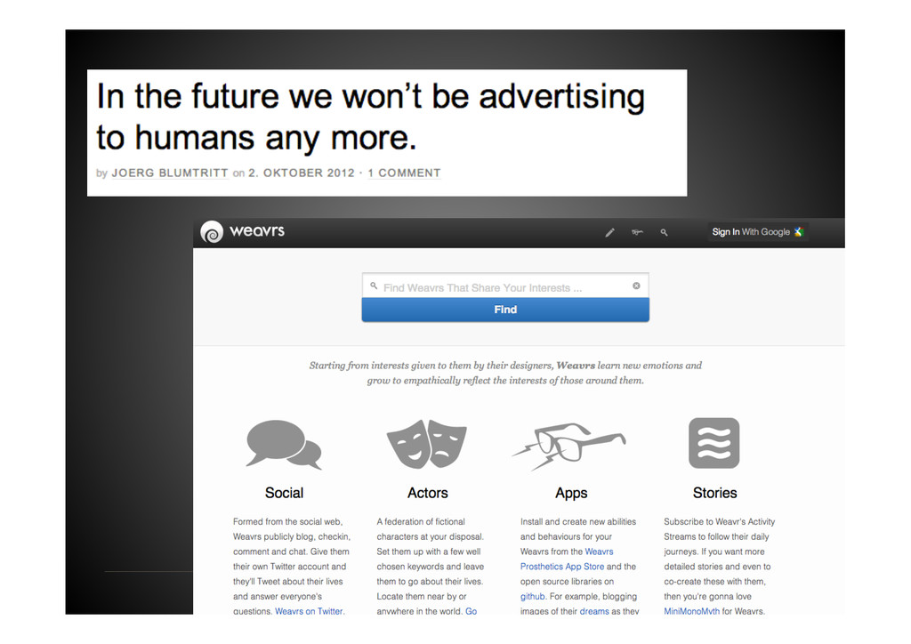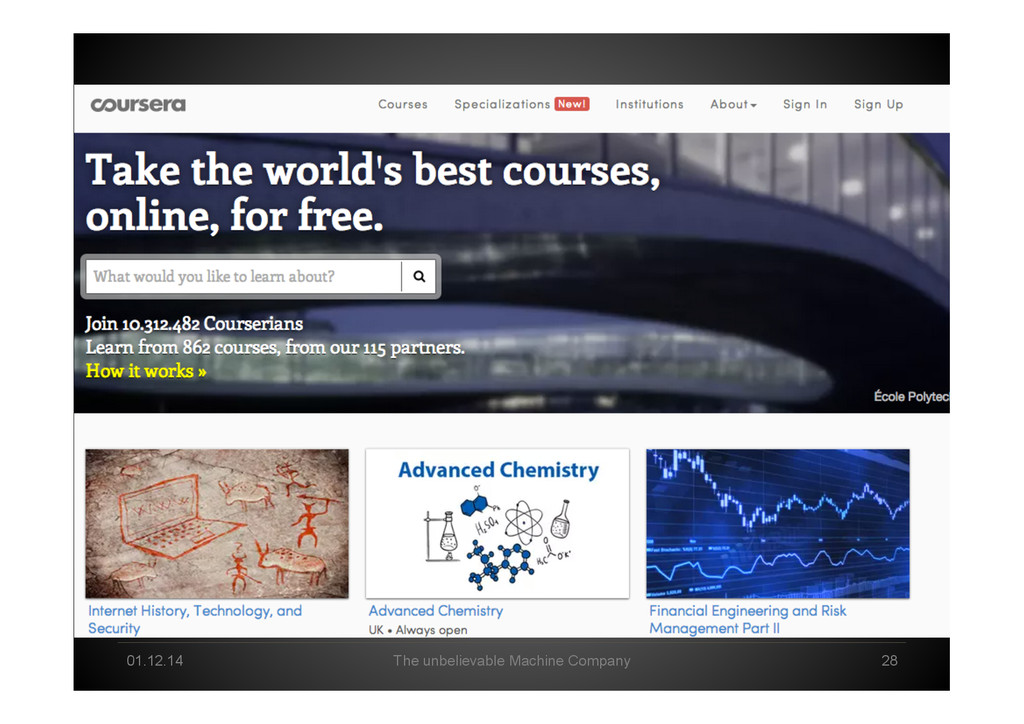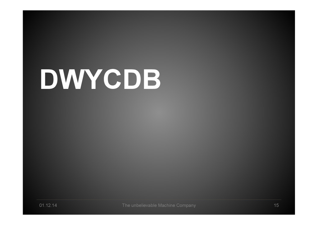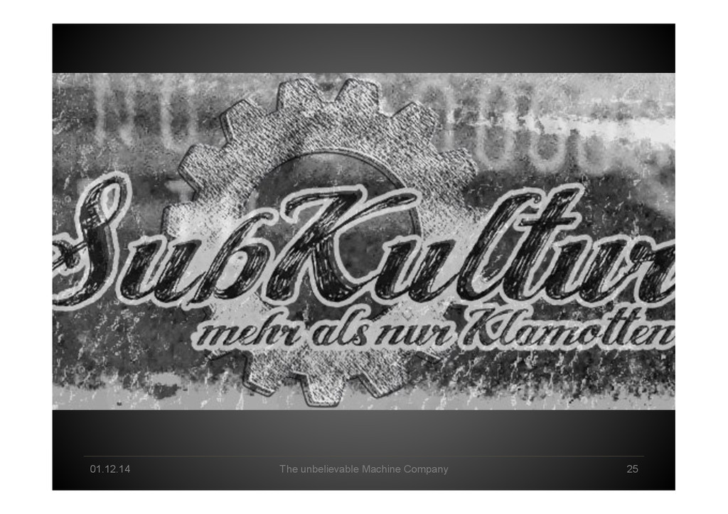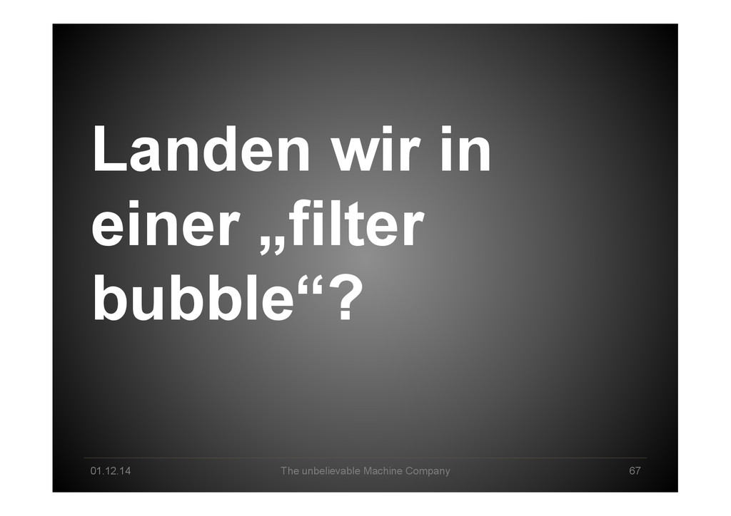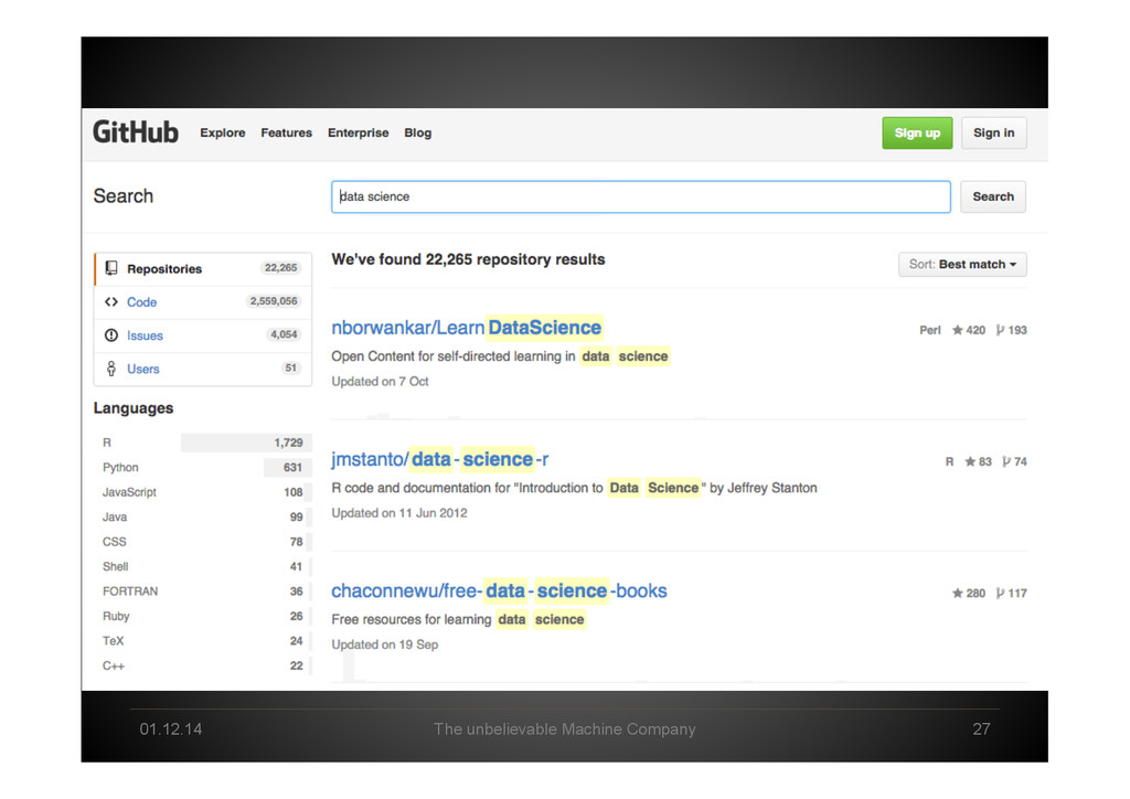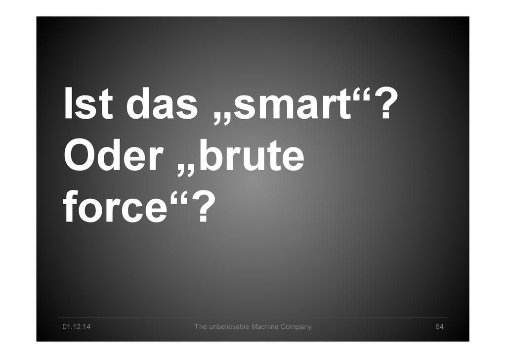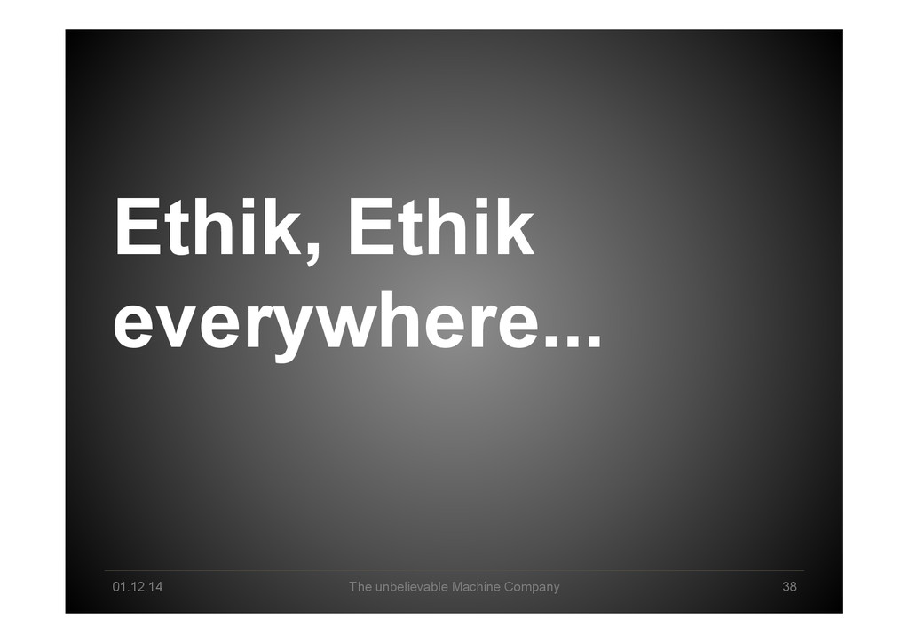 Data Science tomorrow Developer – knowing data & math/stats & applications by heart Professional user – act as a „white layer“ to the black box, know & de<ine input and machine functionalities Explorer – use experience & skills to come up with a profound way to go from data to business value Interpreter – make sense of machine-‐generated hypothesis & con<idence-‐ weighted results, detect „errors“, tune & re-‐run end2end Business-‐Enabler – connect business with big data & create relevant data products Business-‐Supporter – support business operations & be master of the machines?!