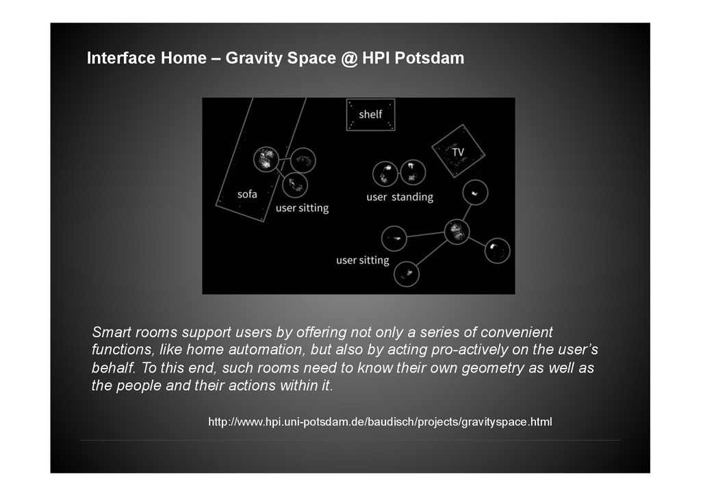of convenient functions, like home automation, but also by acting pro-actively on the user’s behalf. To this end, such rooms need to know their own geometry as well as the people and their actions within it. http://www.hpi.uni-potsdam.de/baudisch/projects/gravityspace.html Interface Home – Gravity Space @ HPI Potsdam