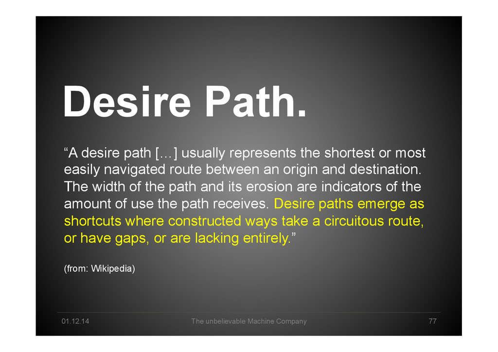 path […] usually represents the shortest or most easily navigated route between an origin and destination. The width of the path and its erosion are indicators of the amount of use the path receives. Desire paths emerge as shortcuts where constructed ways take a circuitous route, or have gaps, or are lacking entirely.” (from: Wikipedia)