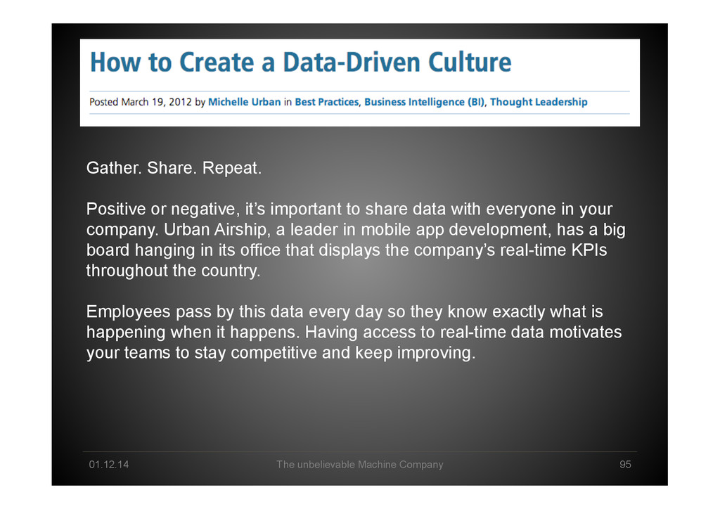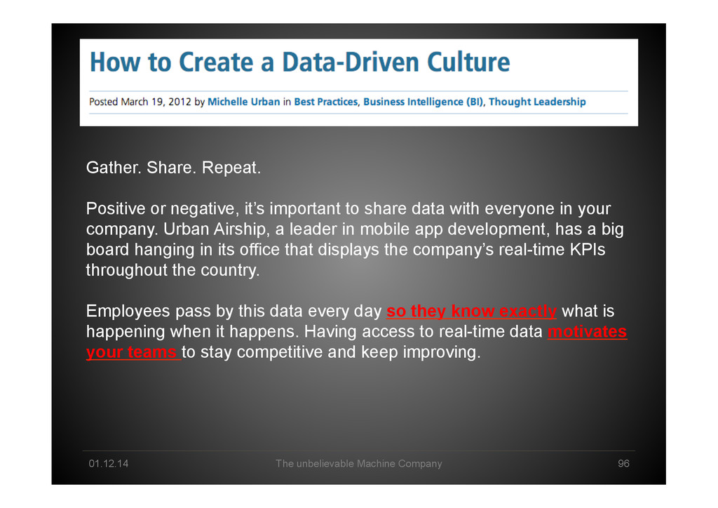 or negative, it’s important to share data with everyone in your company. Urban Airship, a leader in mobile app development, has a big board hanging in its office that displays the company’s real-time KPIs throughout the country. Employees pass by this data every day so they know exactly what is happening when it happens. Having access to real-time data motivates your teams to stay competitive and keep improving.