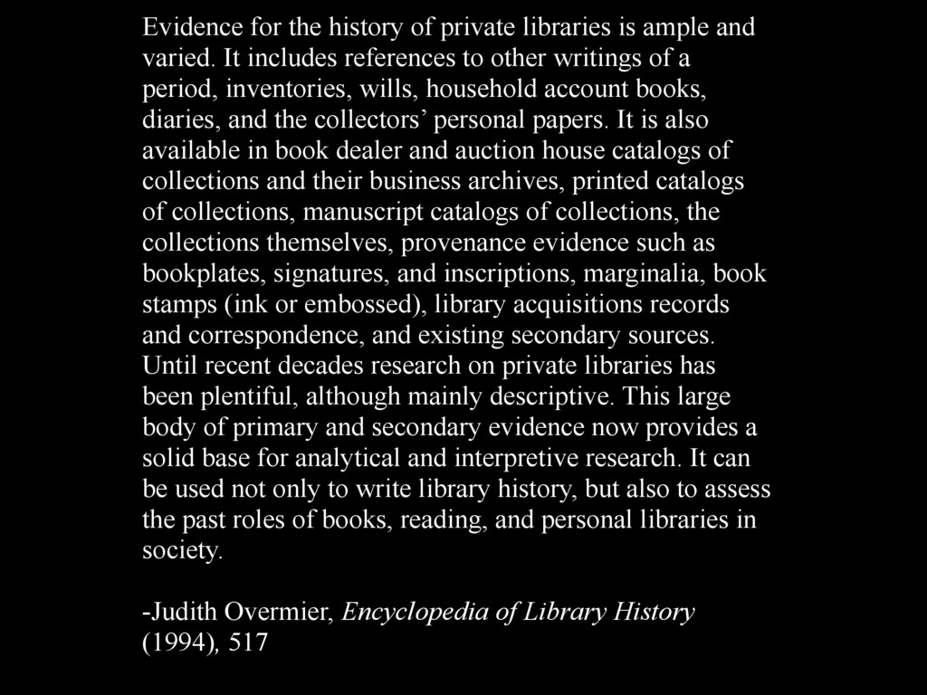 varied. It includes references to other writings of a period, inventories, wills, household account books, diaries, and the collectors’ personal papers. It is also available in book dealer and auction house catalogs of collections and their business archives, printed catalogs of collections, manuscript catalogs of collections, the collections themselves, provenance evidence such as bookplates, signatures, and inscriptions, marginalia, book stamps (ink or embossed), library acquisitions records and correspondence, and existing secondary sources. Until recent decades research on private libraries has been plentiful, although mainly descriptive. This large body of primary and secondary evidence now provides a solid base for analytical and interpretive research. It can be used not only to write library history, but also to assess the past roles of books, reading, and personal libraries in society. -Judith Overmier, Encyclopedia of Library History (1994), 517