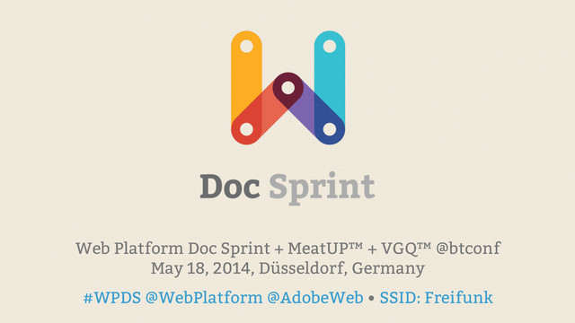 18, 2014, Düsseldorf, Germany #WPDS @WebPlatform @AdobeWeb SSID: Freifunk We did San Francisco, then Mountain View, then Berlin, Seattle ... Zurich, Amsterdam and today: Düsseldorf! wpd.mx/events