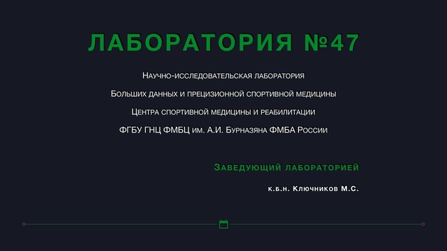 - Спортивная медицина. Научный руководитель: д.м.н., доцент, профессор РАН Самойлов А.С. Выпускник о/и Агенства Стратегических Инициатив для технологических лидеров России «Остров 1021» Европейской коллегии спортивных наук (ECSS) Ассоциации компьютерных наук в спорте 2011-2017 гг. - начальник ОИО / заместитель директора по научной работе ФГБУ ФНКЦСМ ФМБА России 2017-2018 гг. - Заместитель председателя Совета молодых ученых и специалистов ФМБА России Печатных работ - 22 из них ВАК - 13 Индекс Хирша - 5 Рабочей группы по развитию искусственного интеллекта (проект ФМБА России и ПАО Сбербанк) Действующий член: