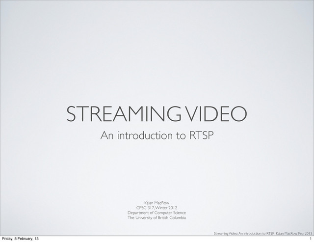 • UDP Connectionless, packets, no guarantees, no ACKs, less overhead • S(RTP) Tradeoff TCP’s guarantees for UDP’s higher throughput • Pump more data, faster! RTSP Real-time Streaming Protocol Streaming Video: An introduction to RTSP. Kalan MacRow Feb. 2013 10 Friday, 8 February, 13