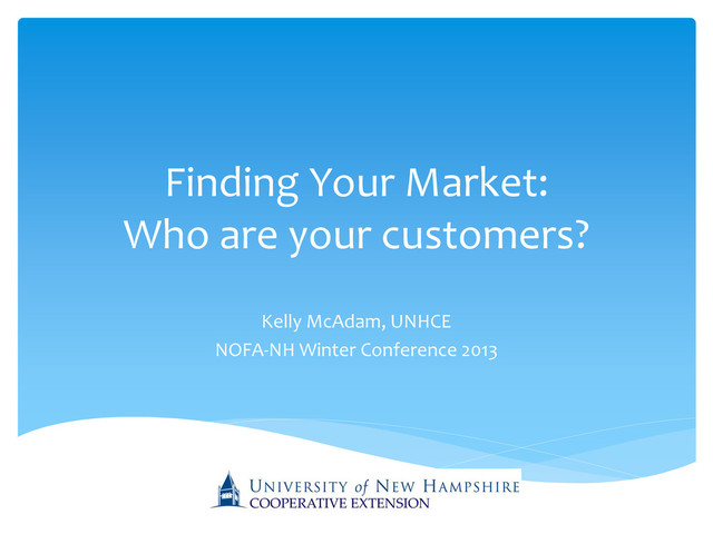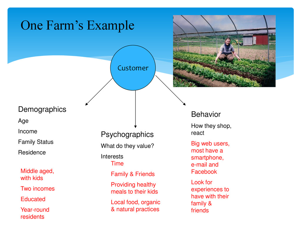 they value? Interests Behavior How they shop, react Middle aged, with kids Two incomes Educated Year-round residents Time Family & Friends Providing healthy meals to their kids Local food, organic & natural practices Big web users, most have a smartphone, e-mail and Facebook Look for experiences to have with their family & friends One Farm’s Example