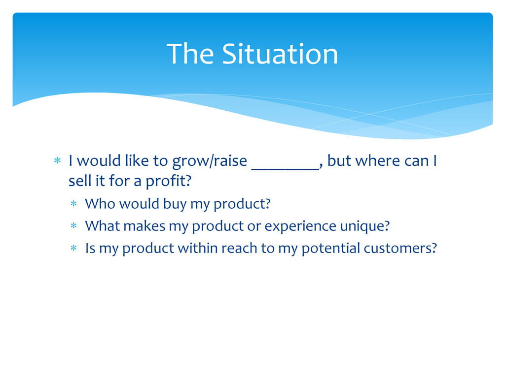 I sell it for a profit? Who would buy my product? What makes my product or experience unique? Is my product within reach to my potential customers? The Situation