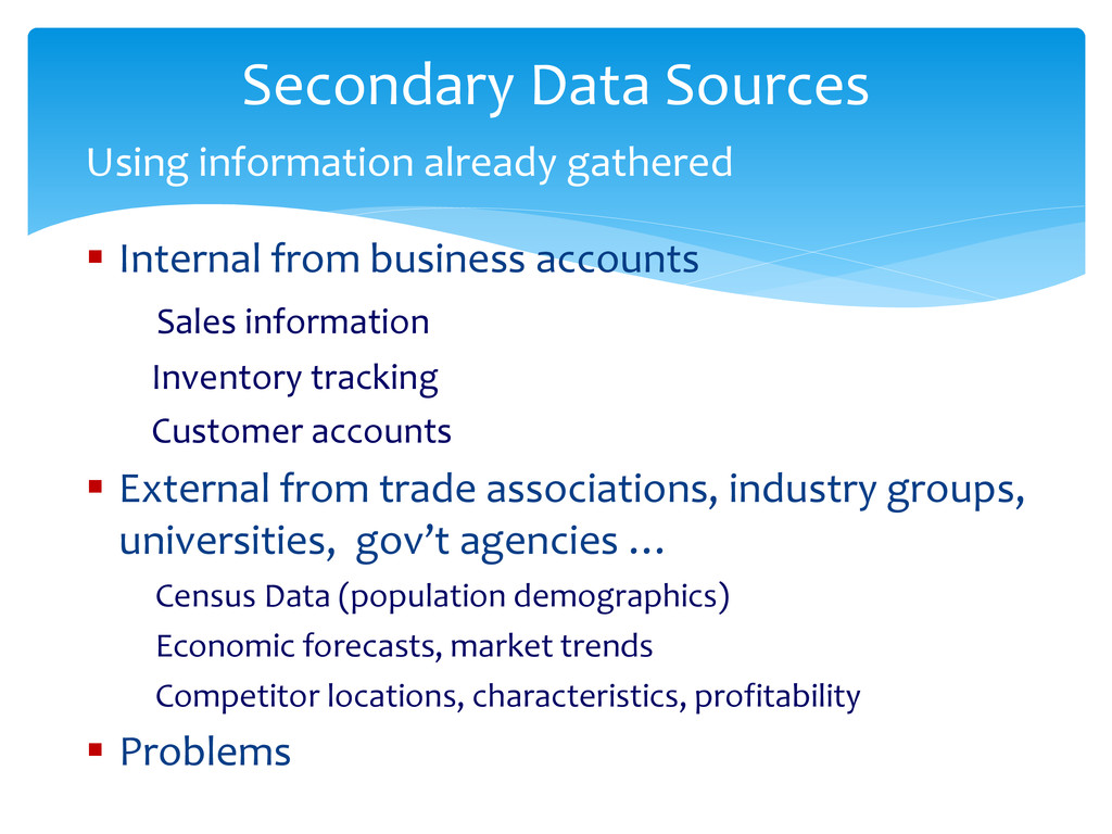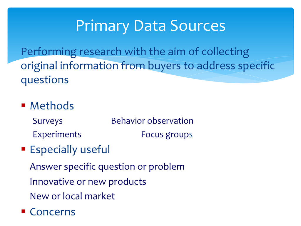 original information from buyers to address specific questions Methods Surveys Behavior observation Experiments Focus groups Especially useful Answer specific question or problem Innovative or new products New or local market Concerns