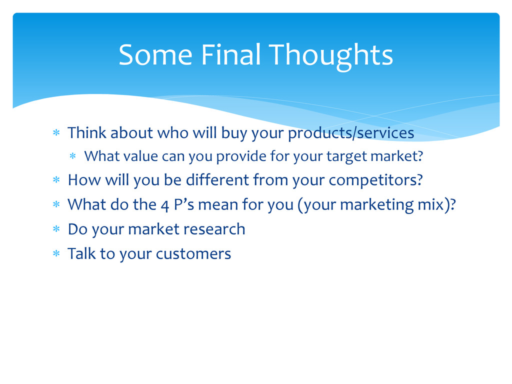 products/services What value can you provide for your target market? How will you be different from your competitors? What do the 4 P’s mean for you (your marketing mix)? Do your market research Talk to your customers