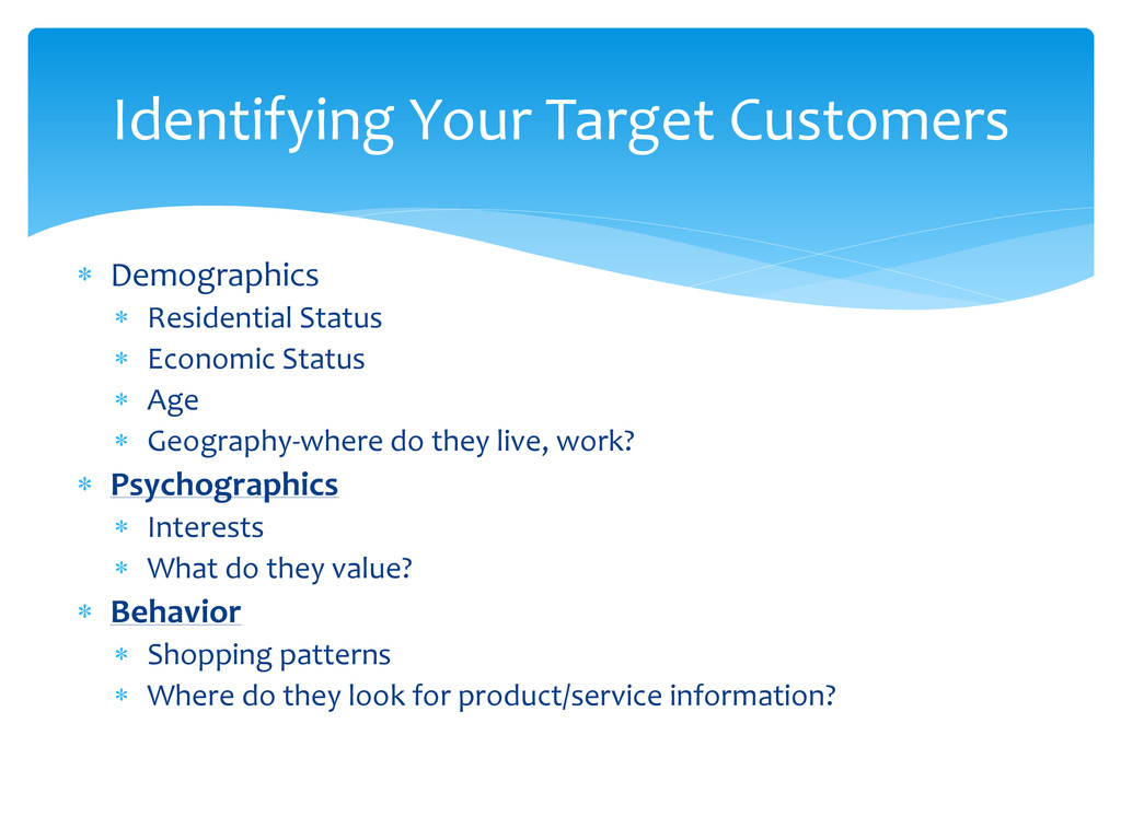 Economic Status Age Geography-where do they live, work? Psychographics Interests What do they value? Behavior Shopping patterns Where do they look for product/service information?