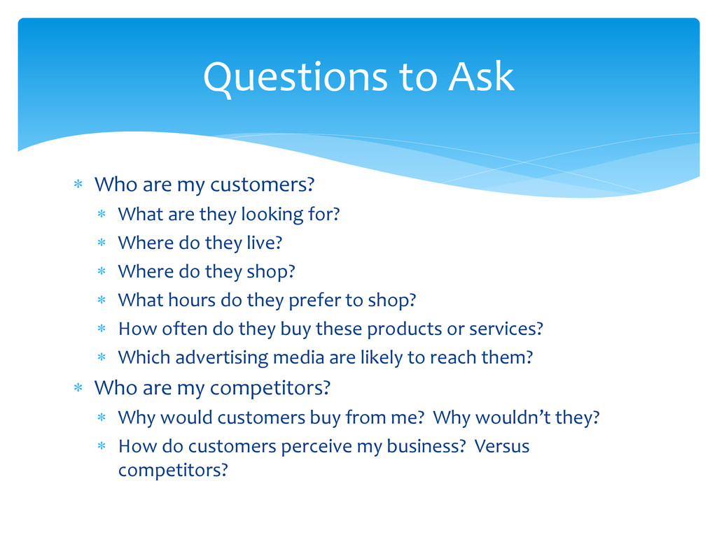 are they looking for? Where do they live? Where do they shop? What hours do they prefer to shop? How often do they buy these products or services? Which advertising media are likely to reach them? Who are my competitors? Why would customers buy from me? Why wouldn’t they? How do customers perceive my business? Versus competitors?
