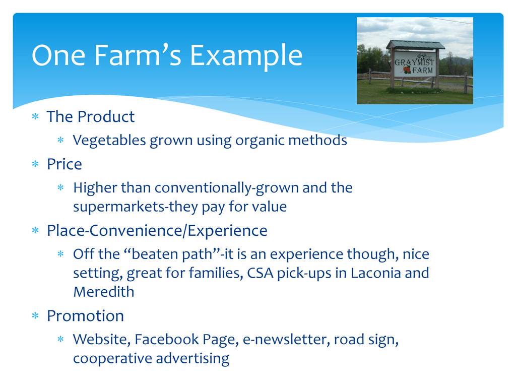 organic methods Price Higher than conventionally-grown and the supermarkets-they pay for value Place-Convenience/Experience Off the “beaten path”-it is an experience though, nice setting, great for families, CSA pick-ups in Laconia and Meredith Promotion Website, Facebook Page, e-newsletter, road sign, cooperative advertising