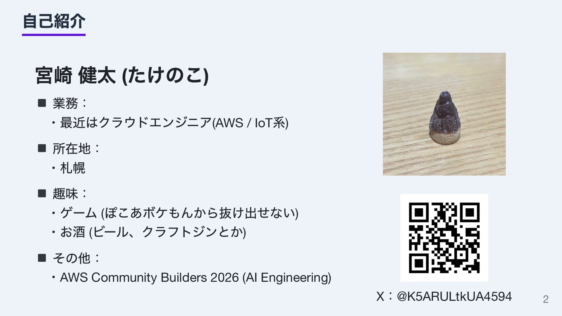 ・札幌 趣味: ・ゲーム ( ぽこあボケもんから抜け出せない) ・お酒 ( ビール、クラフトジンとか) その他: ・AWS Community Builders 2026 (AI Engineering) X :@K5ARULtkUA4594 自己紹介 2