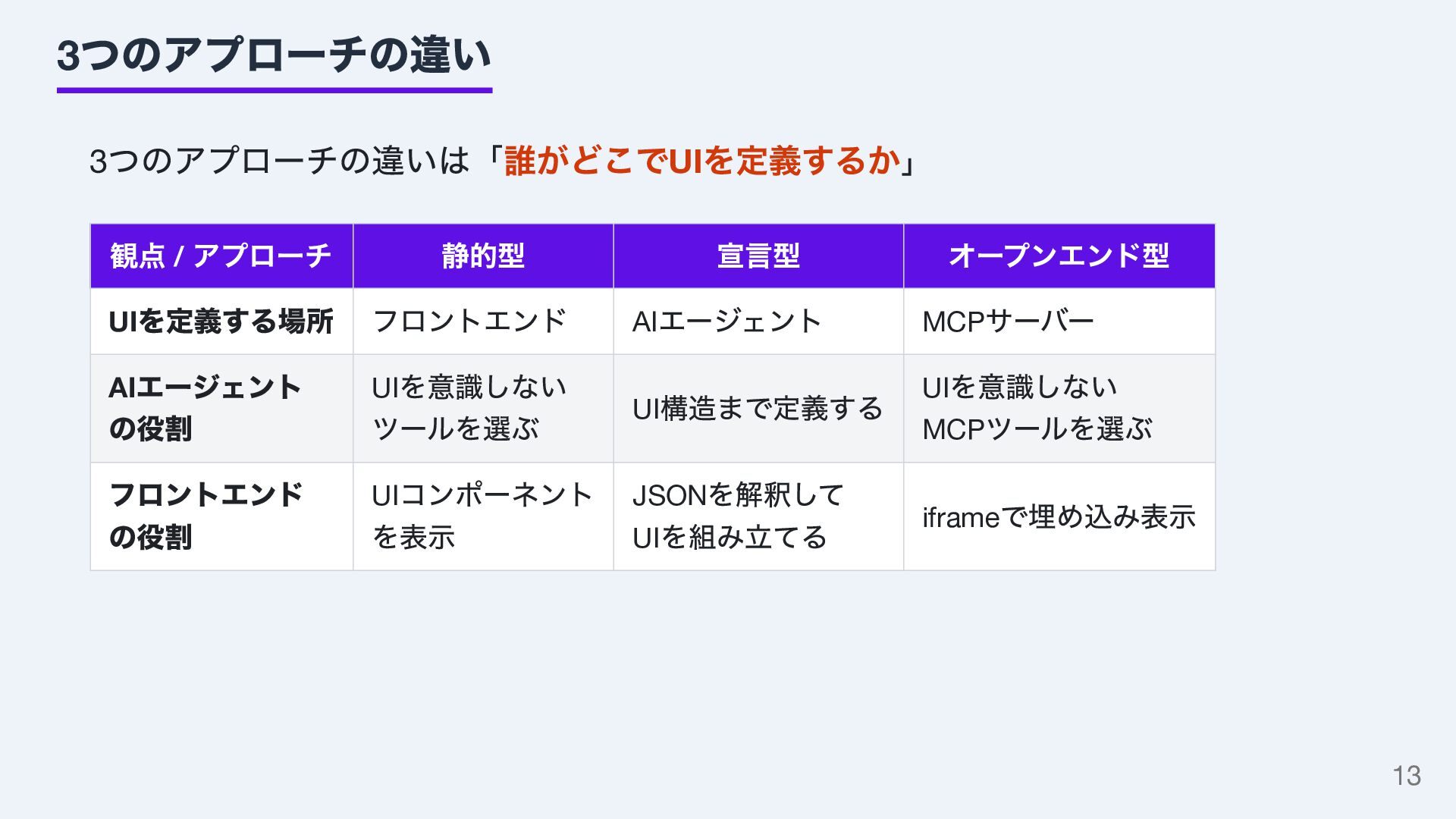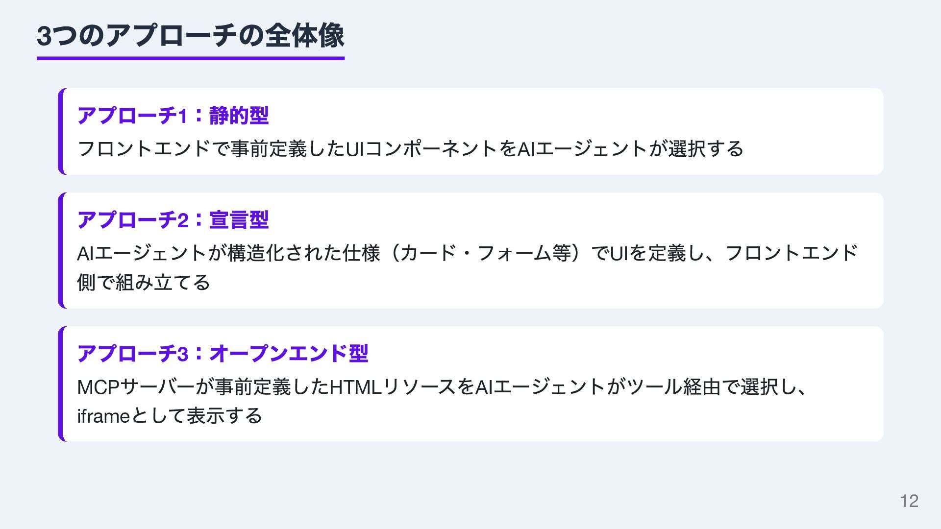 側で組み立てる アプローチ3 :オープンエンド型 MCP サーバーが事前定義したHTML リソースをAI エージェントがツール経由で選択し、 iframe として表示する 3 つのアプローチの全体像 12
