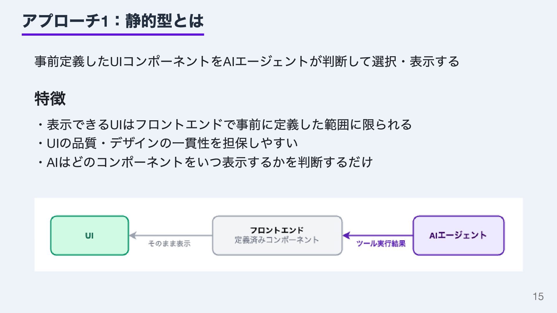 アプローチ1 :静的型 フロントエンドで事前定義したUI コンポーネントをAI エージェントが選択する アプローチ2 :宣言型 AI エージェントが構造化された仕様(カード・フォーム等)でUI を定義し、フロントエンド