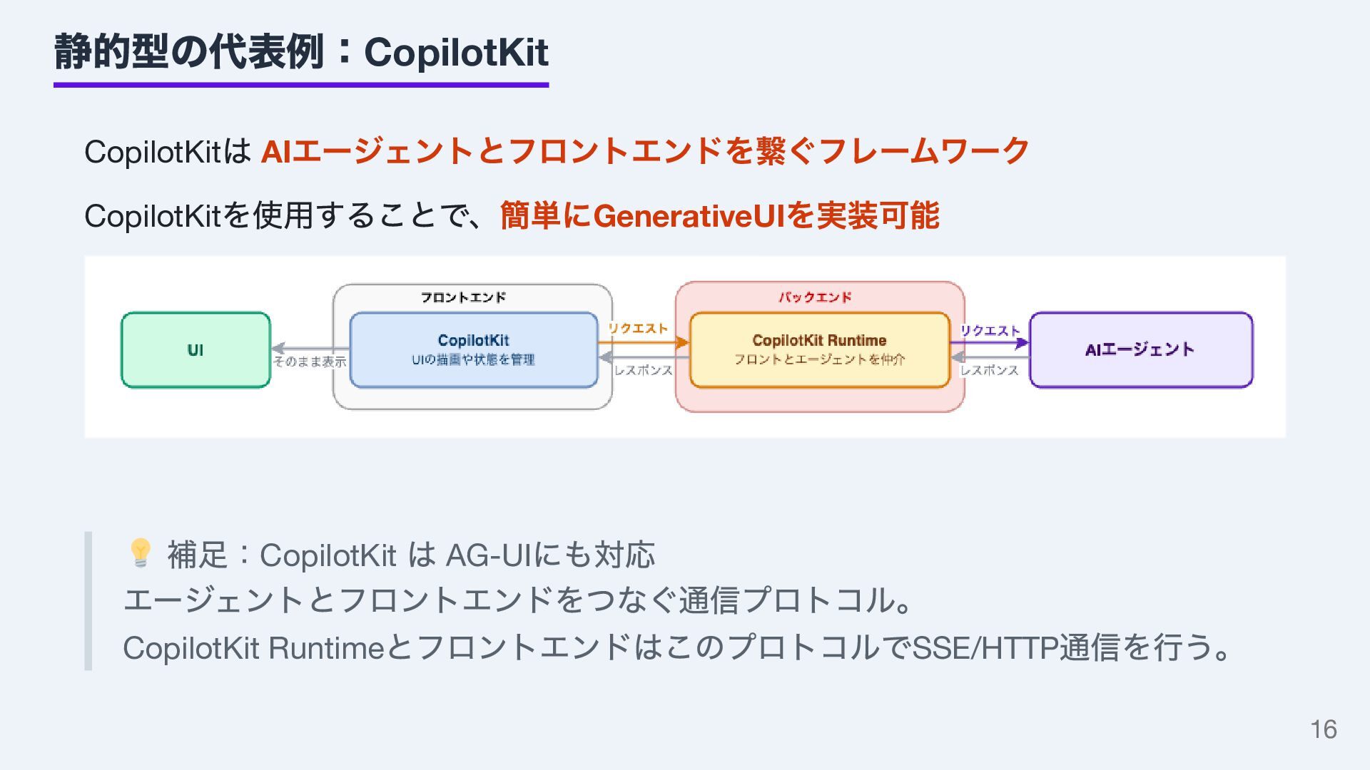 にも対応 エージェントとフロントエンドをつなぐ通信プロトコル。 CopilotKit Runtime とフロントエンドはこのプロトコルでSSE/HTTP 通信を行う。 静的型の代表例:CopilotKit 16