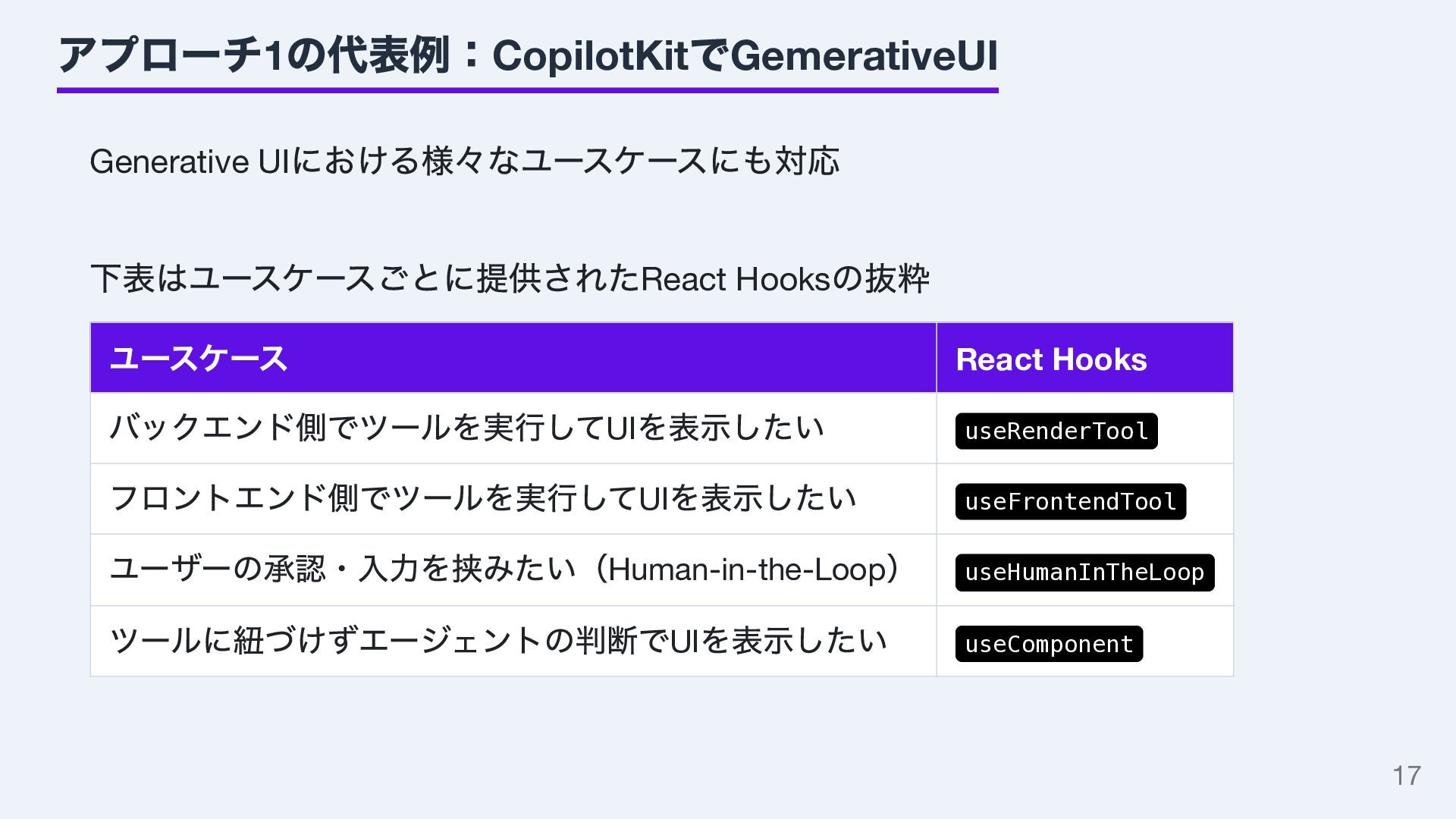Generative UI における様々なユースケースにも対応 下表はユースケースごとに提供されたReact Hooks の抜粋 ユースケース React Hooks バックエンド側でツールを実行してUI
