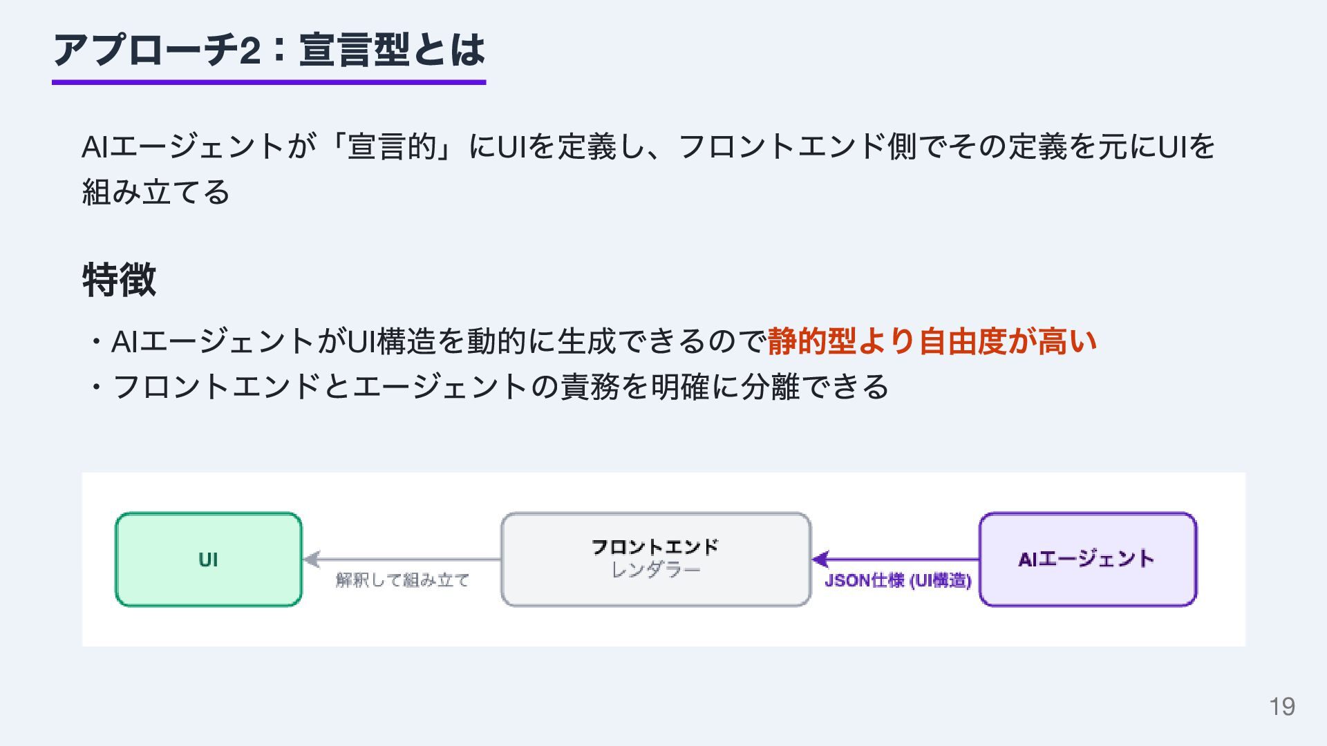 AI エージェントが「宣言的」にUI を定義し、フロントエンド側でその定義を元にUI を 組み立てる 特徴 ・AI エージェントがUI 構造を動的に生成できるので静的型より自由度が高い ・フロントエンドとエージェントの責務を明確に分離できる