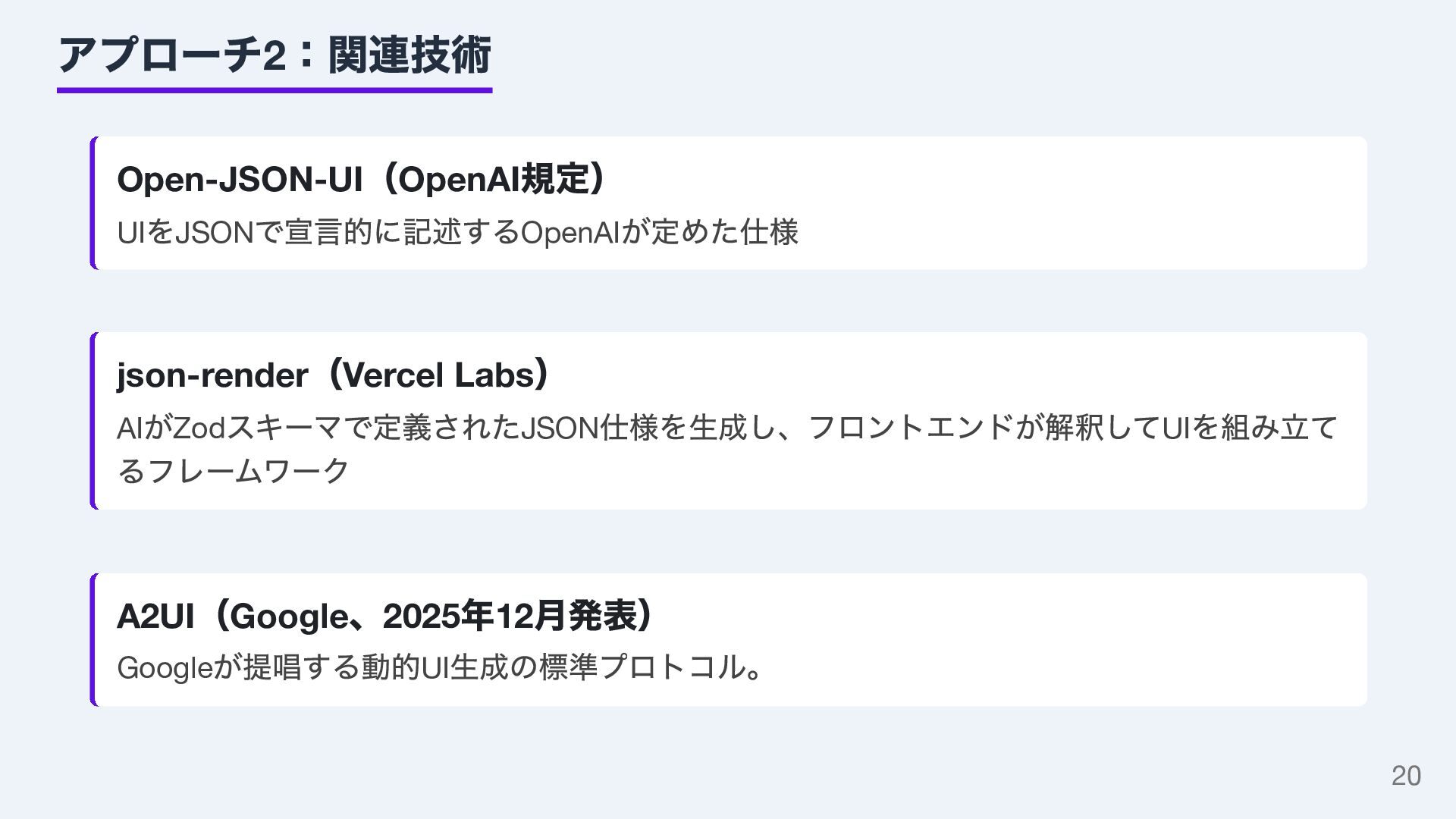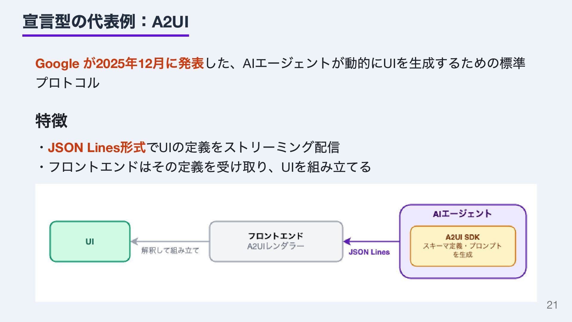 ) AI がZod スキーマで定義されたJSON 仕様を生成し、フロントエンドが解釈してUI を組み立て るフレームワーク A2UI (Google 、2025 年12 月発表) Google が提唱する動的UI 生成の標準プロトコル。 アプローチ2 :関連技術 20
