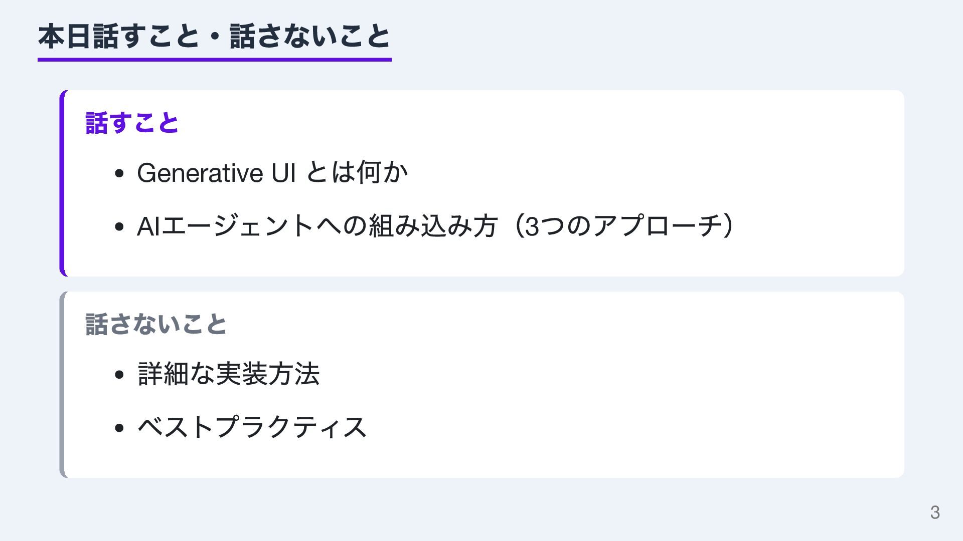 話すこと Generative UI とは何か AI エージェントへの組み込み方(3 つのアプローチ) 話さないこと 詳細な実装方法 ベストプラクティス