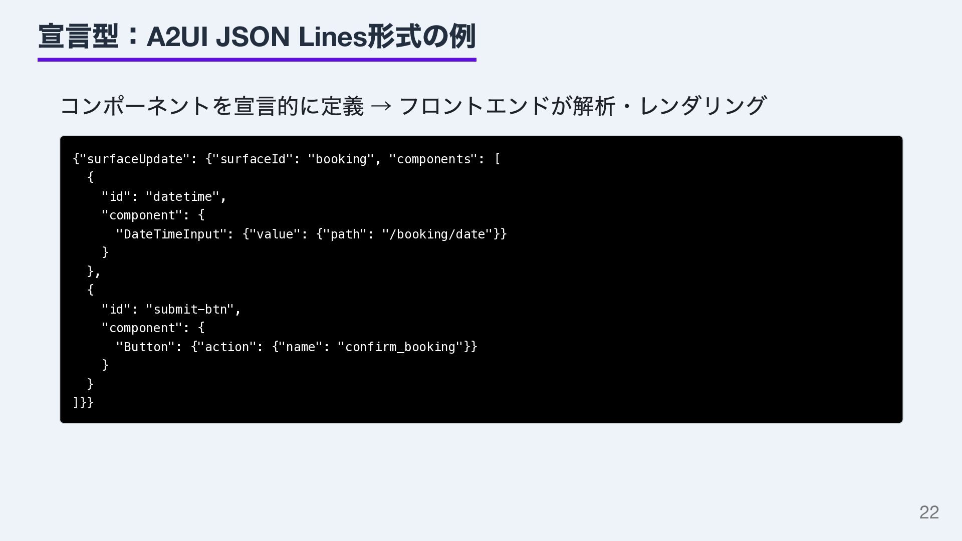 "datetime", "component": { "DateTimeInput": {"value": {"path": "/booking/date"}} } }, { "id": "submit-btn", "component": { "Button": {"action": {"name": "confirm_booking"}} } } ]}} 宣言型:A2UI JSON Lines 形式の例 22
