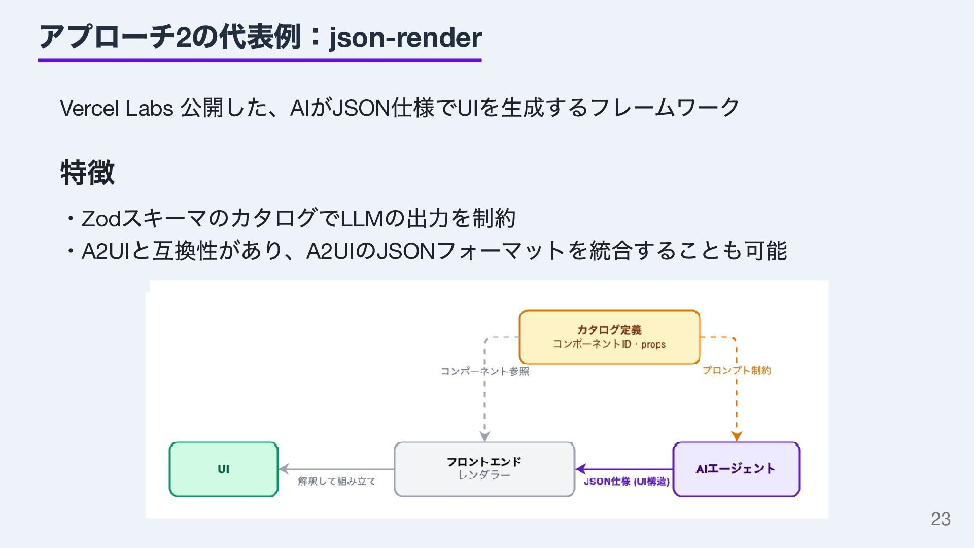 ・A2UI と互換性があり、A2UI のJSON フォーマットを統合することも可能 アプローチ2 の代表例:json-render 23