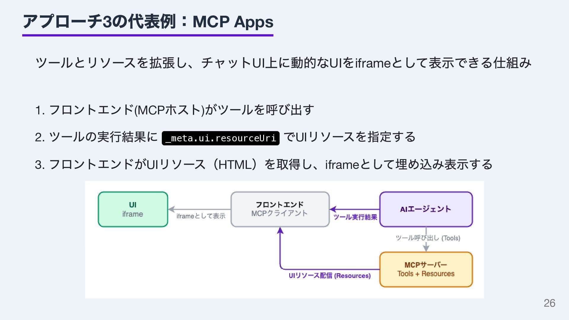 ・逆にいうとMCP サーバーの構築が必要 MCP とは? AI とツール・データを繋ぐ標準プロトコル。 MCP Apps は、MCP サーバーの Tools と Resources 活用した仕組み アプローチ3 :オープンエンド型とは 25