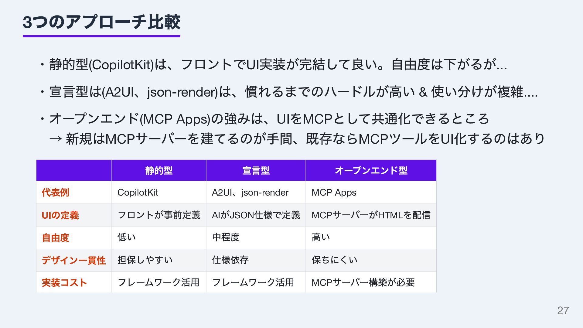の強みは、UI をMCP として共通化できるところ → 新規はMCP サーバーを建てるのが手間、既存ならMCP ツールをUI 化するのはあり 静的型 宣言型 オープンエンド型 代表例 CopilotKit A2UI 、json-render MCP Apps UI の定義 フロントが事前定義 AI がJSON 仕様で定義 MCP サーバーがHTML を配信 自由度 低い 中程度 高い デザイン一貫性 担保しやすい 仕様依存 保ちにくい 実装コスト フレームワーク活用 フレームワーク活用 MCP サーバー構築が必要 3 つのアプローチ比較 27
