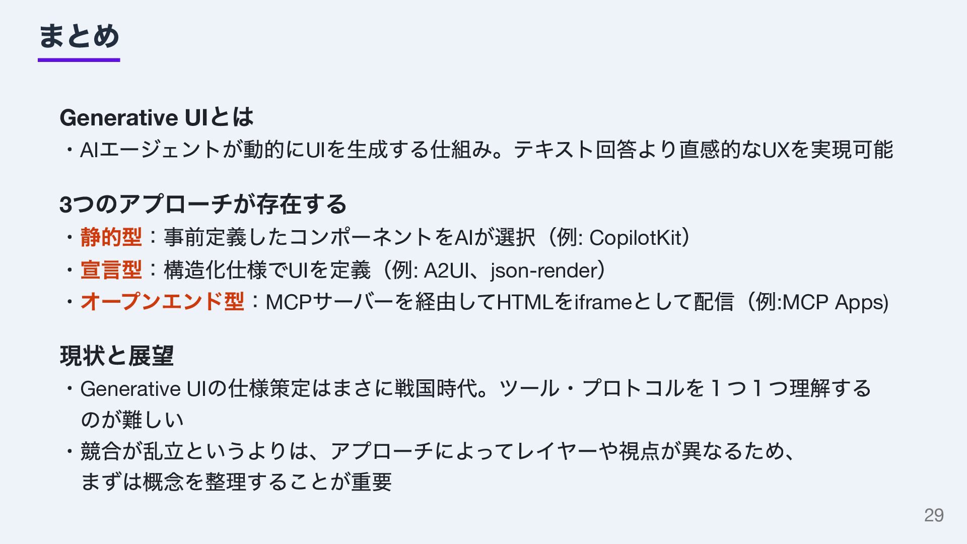 が選択(例: CopilotKit ) ・宣言型:構造化仕様でUI を定義(例: A2UI 、json-render ) ・オープンエンド型:MCP サーバーを経由してHTML をiframe として配信(例:MCP Apps) 現状と展望 ・Generative UI の仕様策定はまさに戦国時代。ツール・プロトコルを1つ1つ理解する のが難しい ・競合が乱立というよりは、アプローチによってレイヤーや視点が異なるため、 まずは概念を整理することが重要 まとめ 29