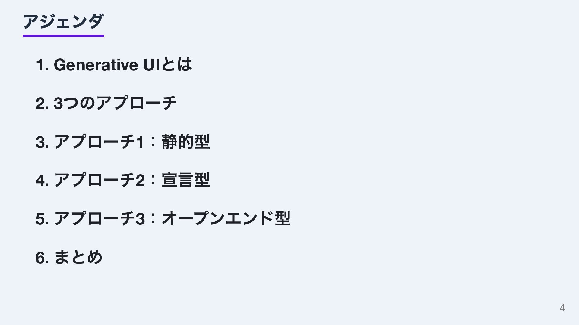 1. Generative UI とは 2. 3 つのアプローチ 3. アプローチ1 :静的型