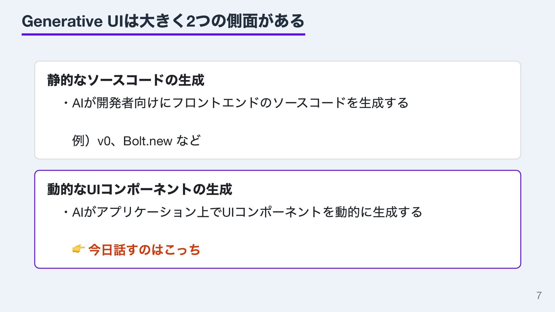 コンポーネントを動的に生成する 👉 今日話すのはこっち Generative UI は大きく2 つの側面がある 7