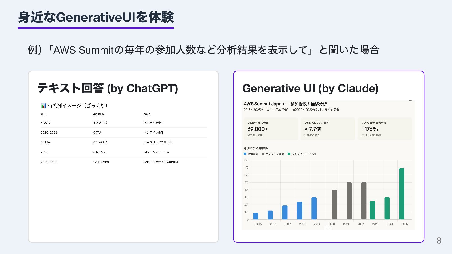 例) 「AWS Summit の毎年の参加人数など分析結果を表示して」と聞いた場合 テキスト回答 (by ChatGPT) Generative UI (by