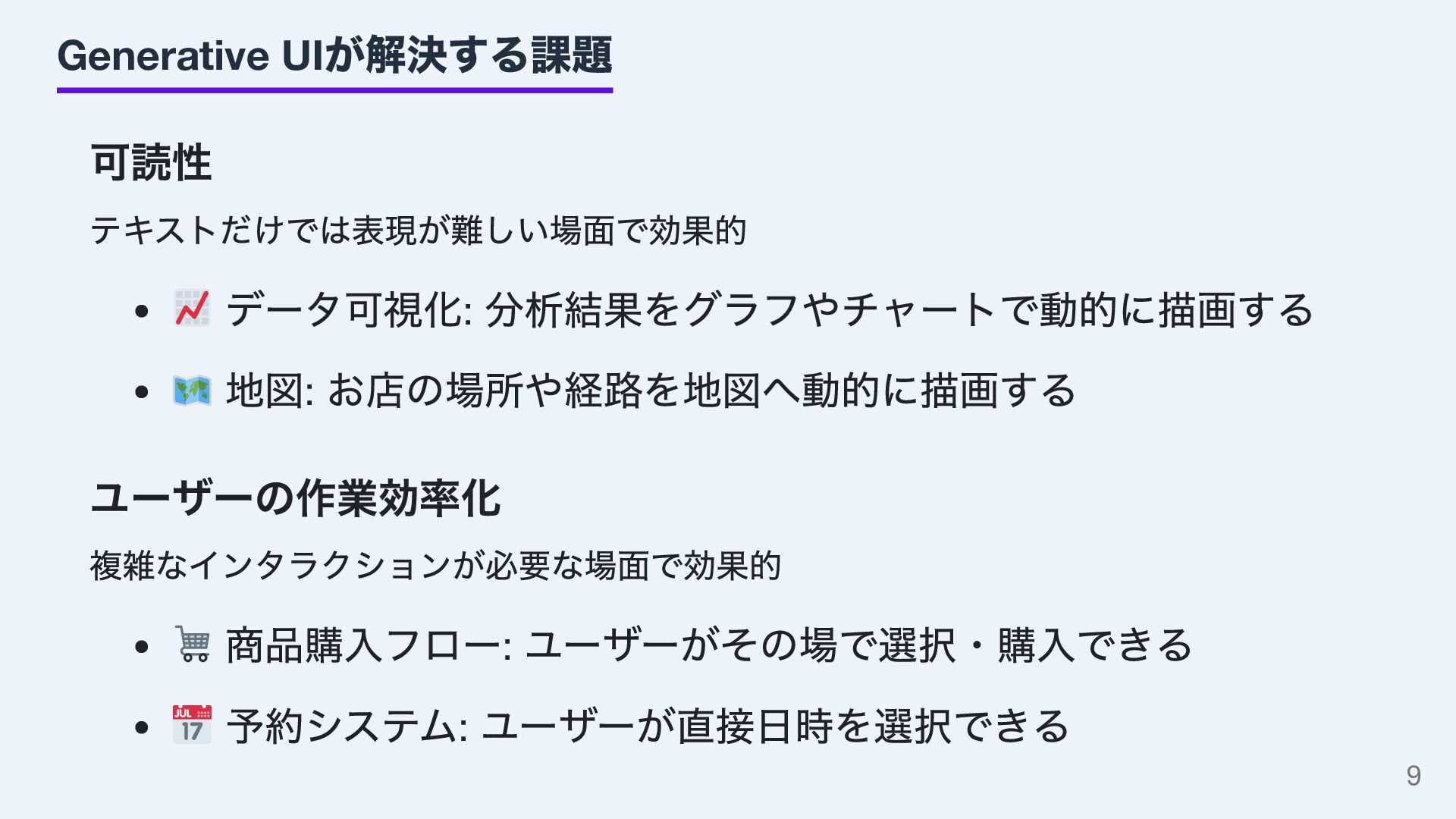 可読性 テキストだけでは表現が難しい場面で効果的 データ可視化: 分析結果をグラフやチャートで動的に描画する 地図: お店の場所や経路を地図へ動的に描画する ユーザーの作業効率化 複雑なインタラクションが必要な場面で効果的 商品購入フロー: ユーザーがその場で選択・購入できる