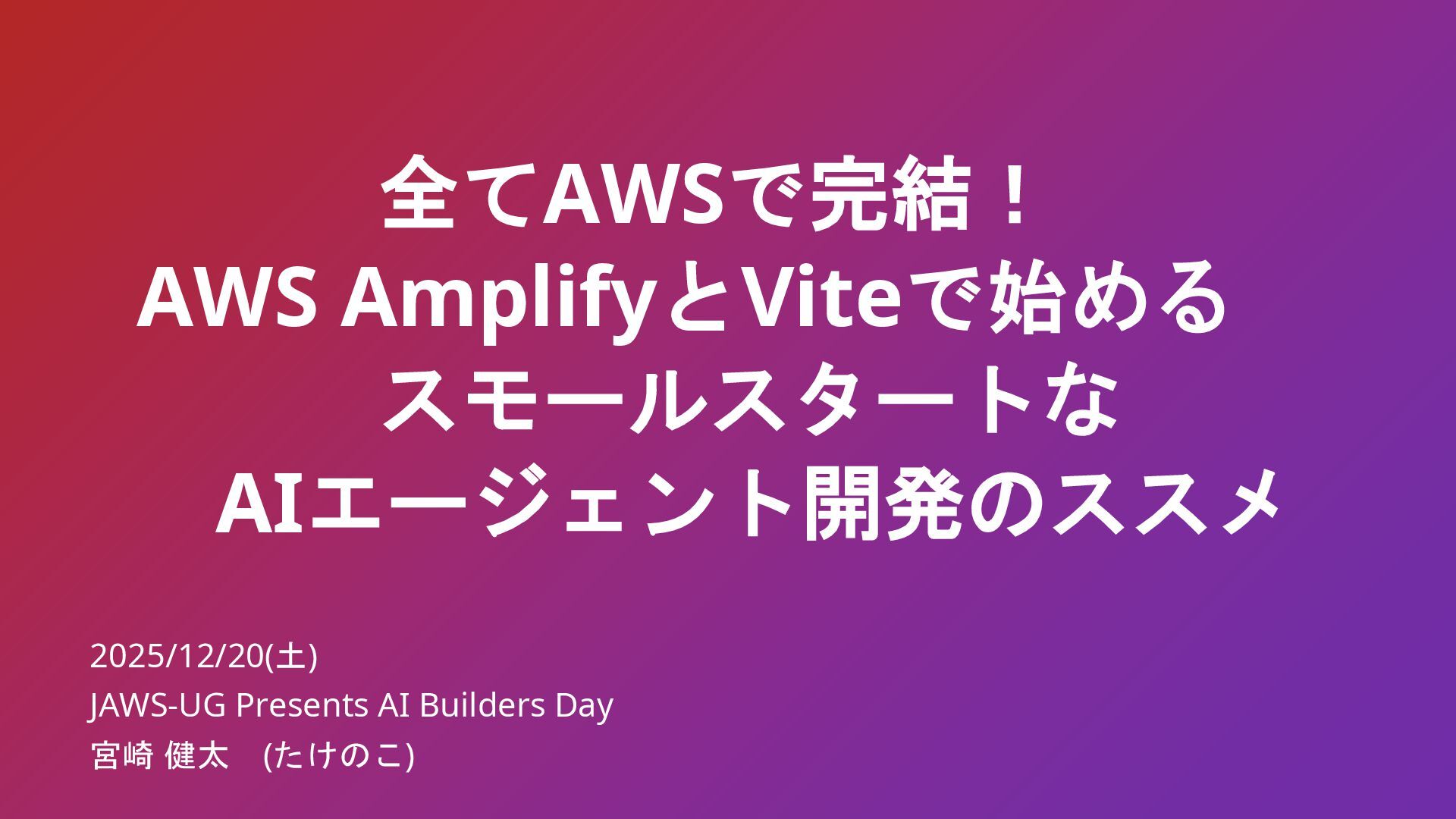 全てAWSで完結! AWS AmplifyとViteで始める スモールスタートな AIエージェント開発のススメ 2025/12/20(土) JAWS-UG Presents AI Builders