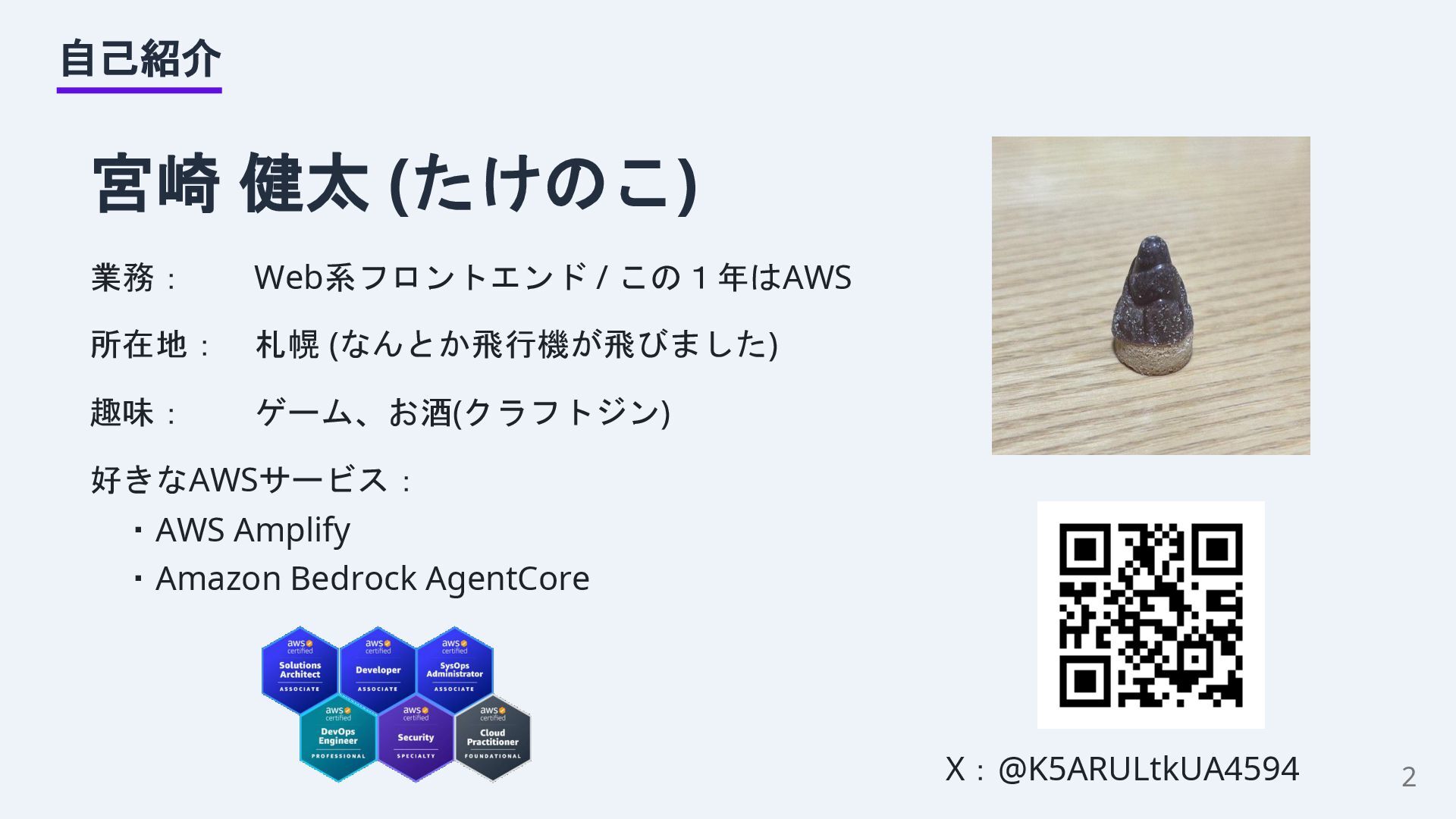 趣味: ゲーム、お酒(クラフトジン) 好きなAWSサービス: ・AWS Amplify ・Amazon Bedrock AgentCore X:@K5ARULtkUA4594 自己紹介 2