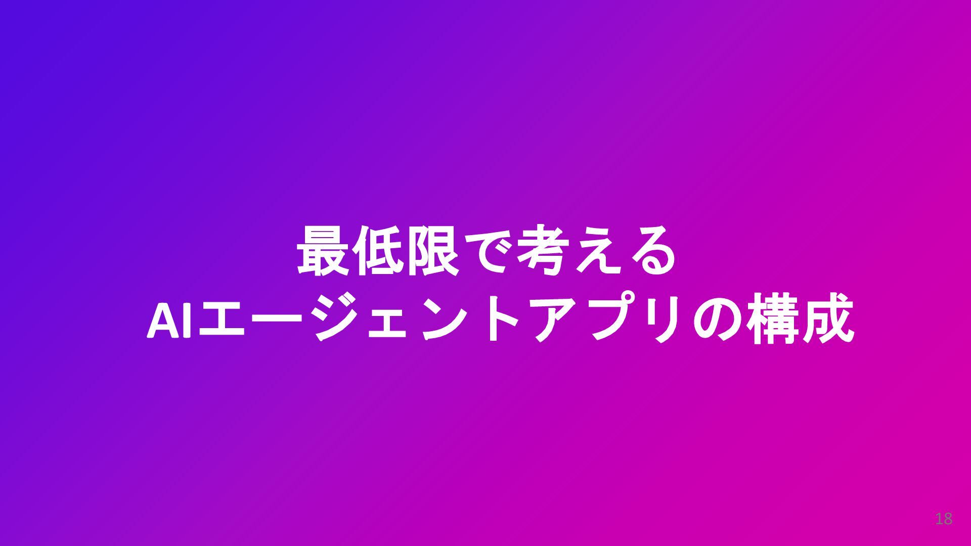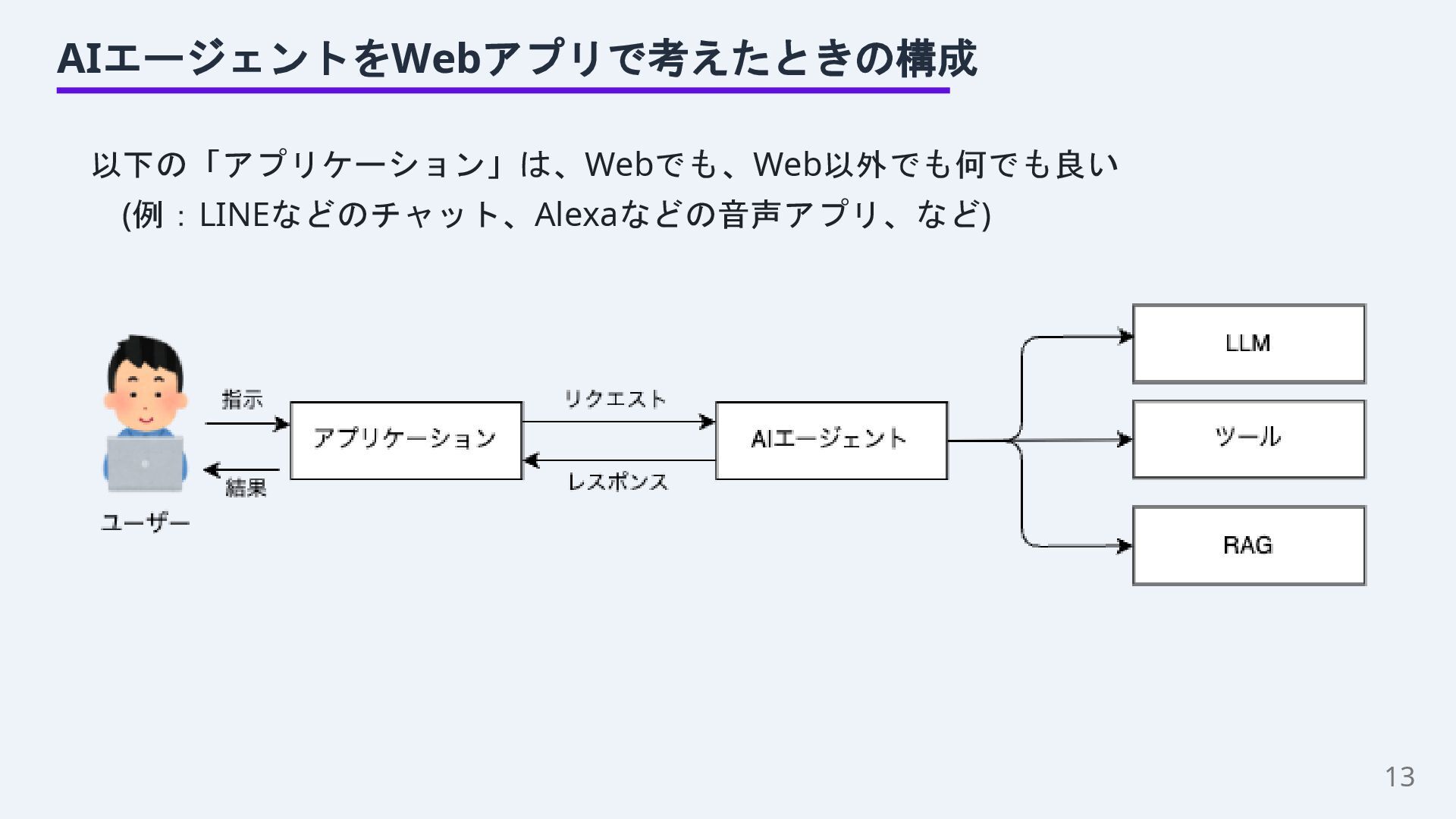 以下の「アプリケーション」は、Webでも、Web以外でも何でも良い (例:LINEなどのチャット、Alexaなどの音声アプリ、など) AIエージェントをWebアプリで考えたときの構成 13