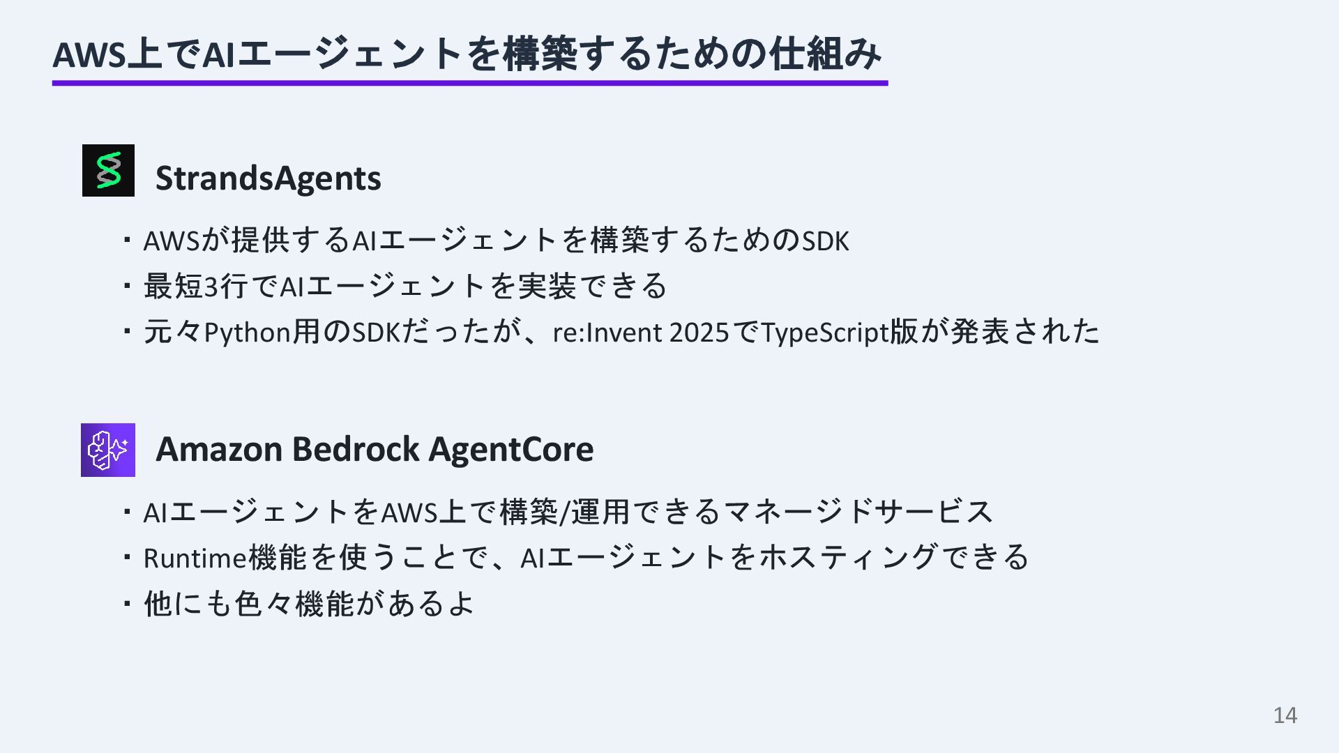 StrandsAgents ・AWSが提供するAIエージェントを構築するためのSDK ・最短3行でAIエージェントを実装できる ・元々Python用のSDKだったが、re:Invent 2025でTypeScript版が発表された Amazon Bedrock AgentCore ・AIエージェントをAWS上で構築/運用できるマネージドサービス ・Runtime機能を使うことで、AIエージェントをホスティングできる
