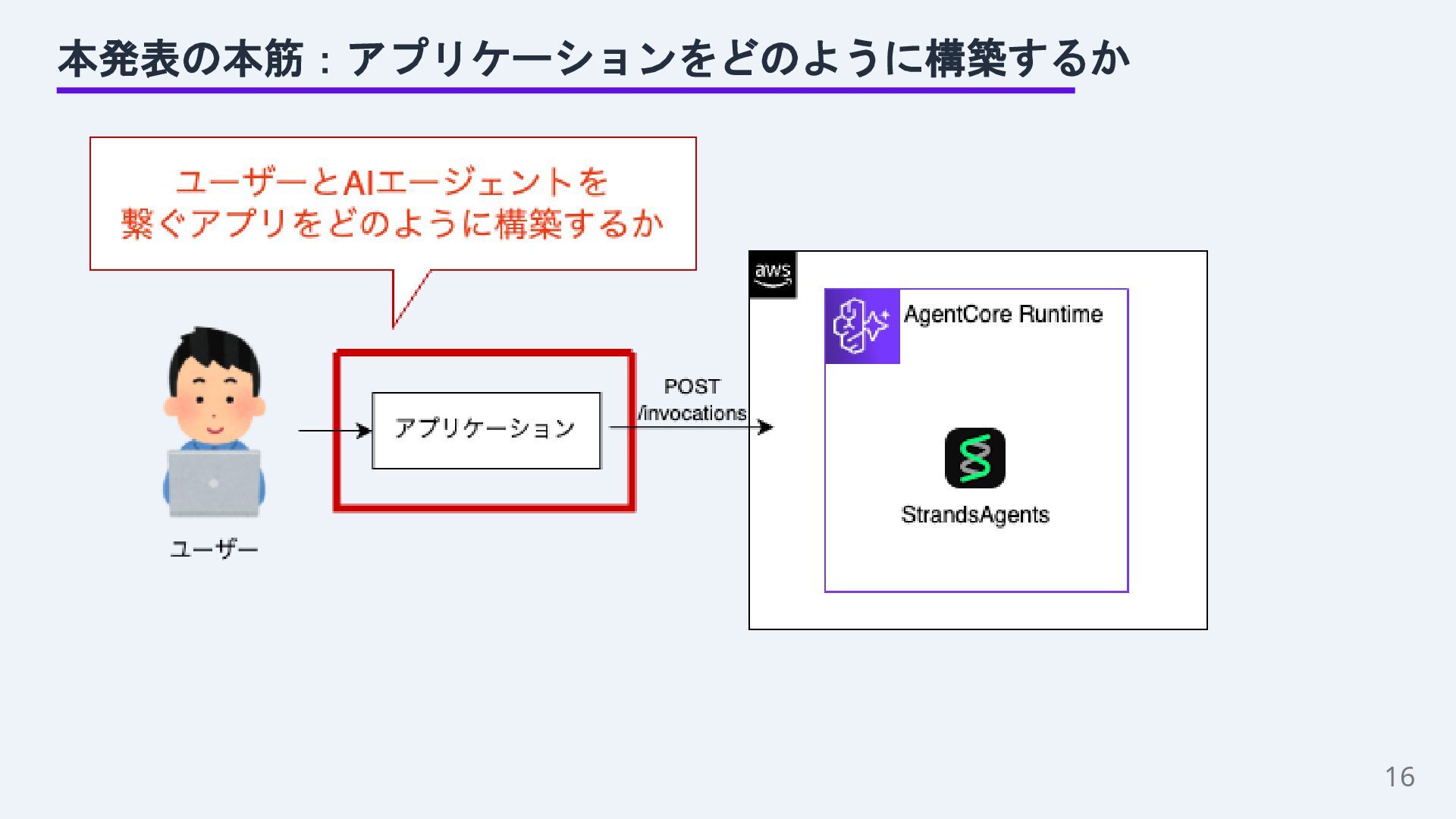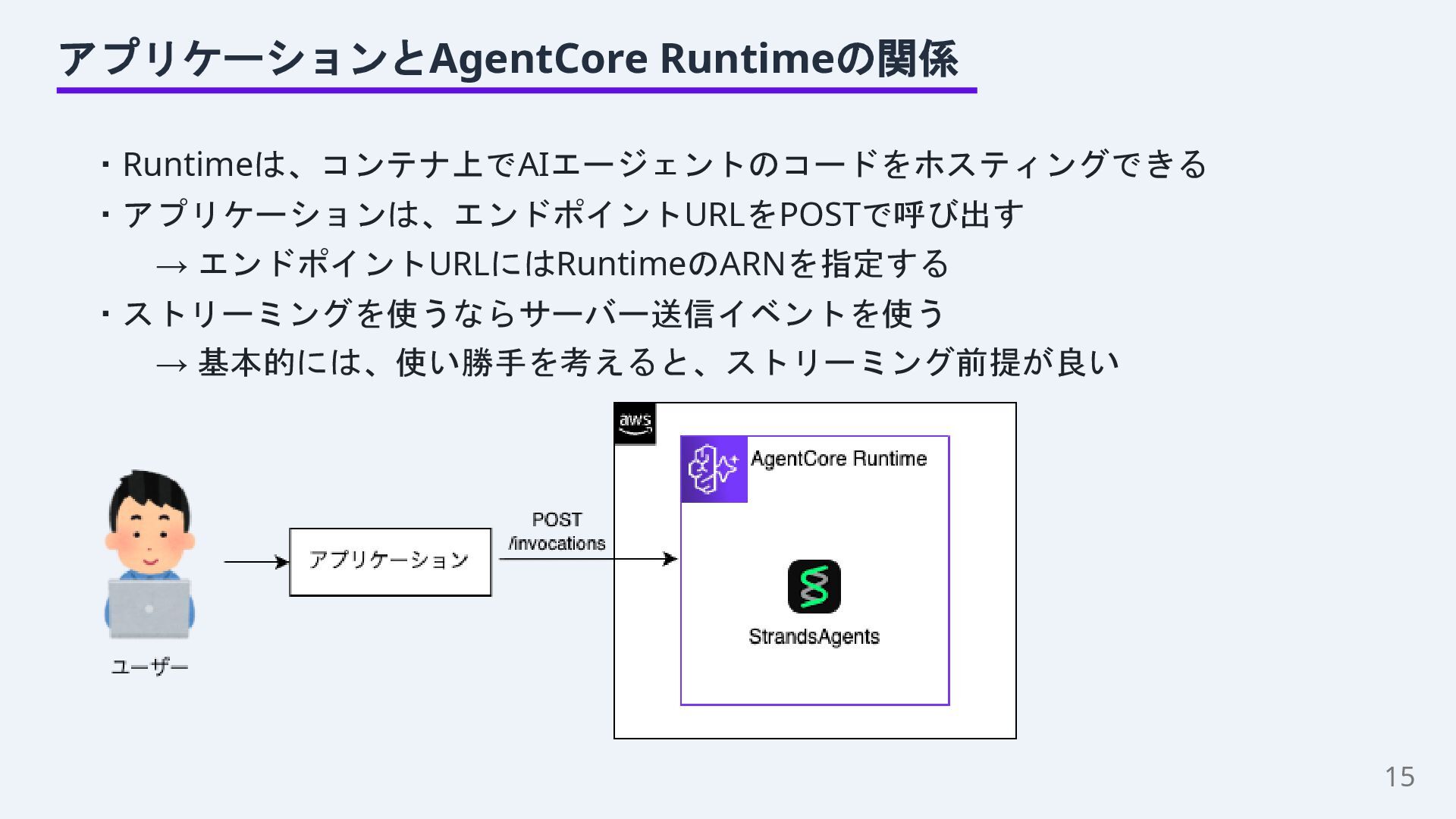 ・Runtimeは、コンテナ上でAIエージェントのコードをホスティングできる ・アプリケーションは、エンドポイントURLをPOSTで呼び出す → エンドポイントURLにはRuntimeのARNを指定する ・ストリーミングを使うならサーバー送信イベントを使う → 基本的には、使い勝手を考えると、ストリーミング前提が良い アプリケーションとAgentCore Runtimeの関係 15