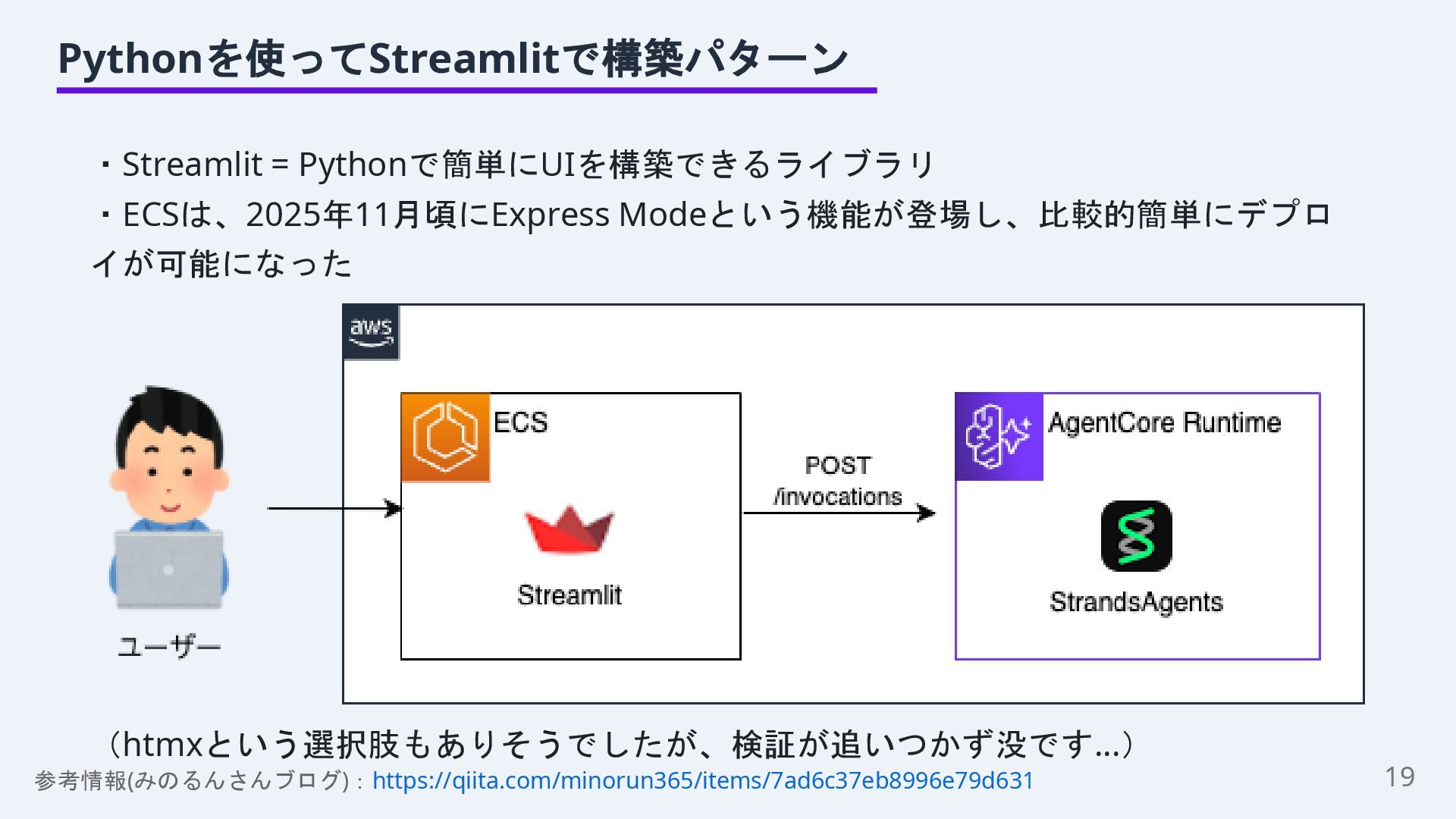 ・Streamlit = Pythonで簡単にUIを構築できるライブラリ ・ECSは、2025年11月頃にExpress Modeという機能が登場し、比較的簡単にデプロ イが可能になった (htmxという選択肢もありそうでしたが、検証が追いつかず没です...) Pythonを使ってStreamlitで構築パターン 参考情報(みのるんさんブログ):https://qiita.com/minorun365/items/7ad6c37eb8996e79d631 19