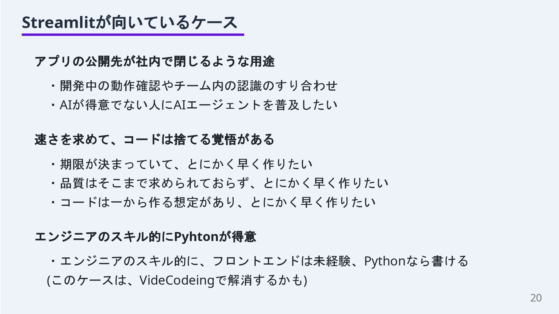 アプリの公開先が社内で閉じるような用途 ・開発中の動作確認やチーム内の認識のすり合わせ ・AIが得意でない人にAIエージェントを普及したい 速さを求めて、コードは捨てる覚悟がある ・期限が決まっていて、とにかく早く作りたい ・品質はそこまで求められておらず、とにかく早く作りたい ・コードは一から作る想定があり、とにかく早く作りたい エンジニアのスキル的にPyhtonが得意 ・エンジニアのスキル的に、フロントエンドは未経験、Pythonなら書ける (このケースは、VideCodeingで解消するかも)