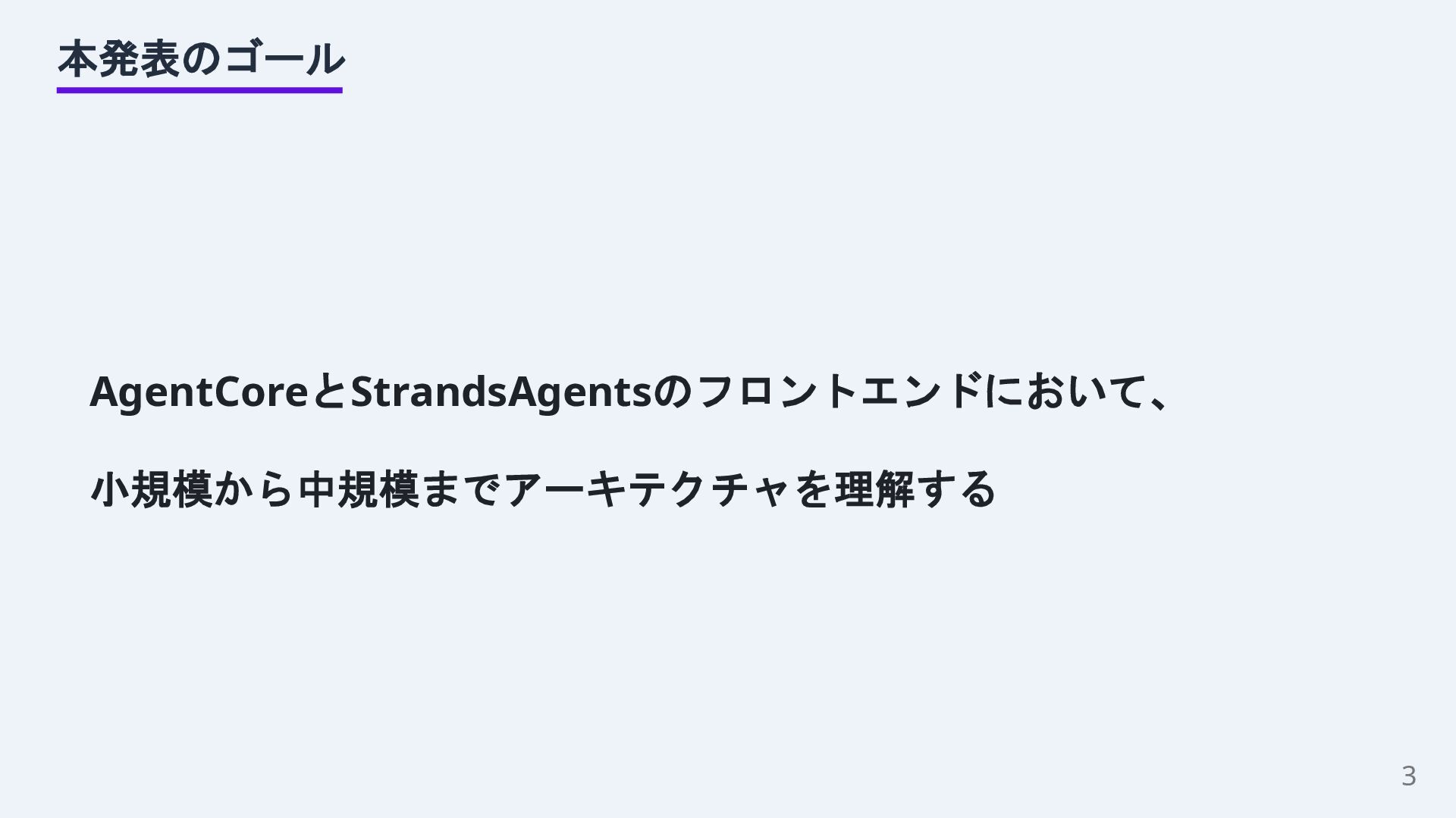 AgentCoreとStrandsAgentsのフロントエンドにおいて、 小規模から中規模までアーキテクチャを理解する 本発表のゴール 3