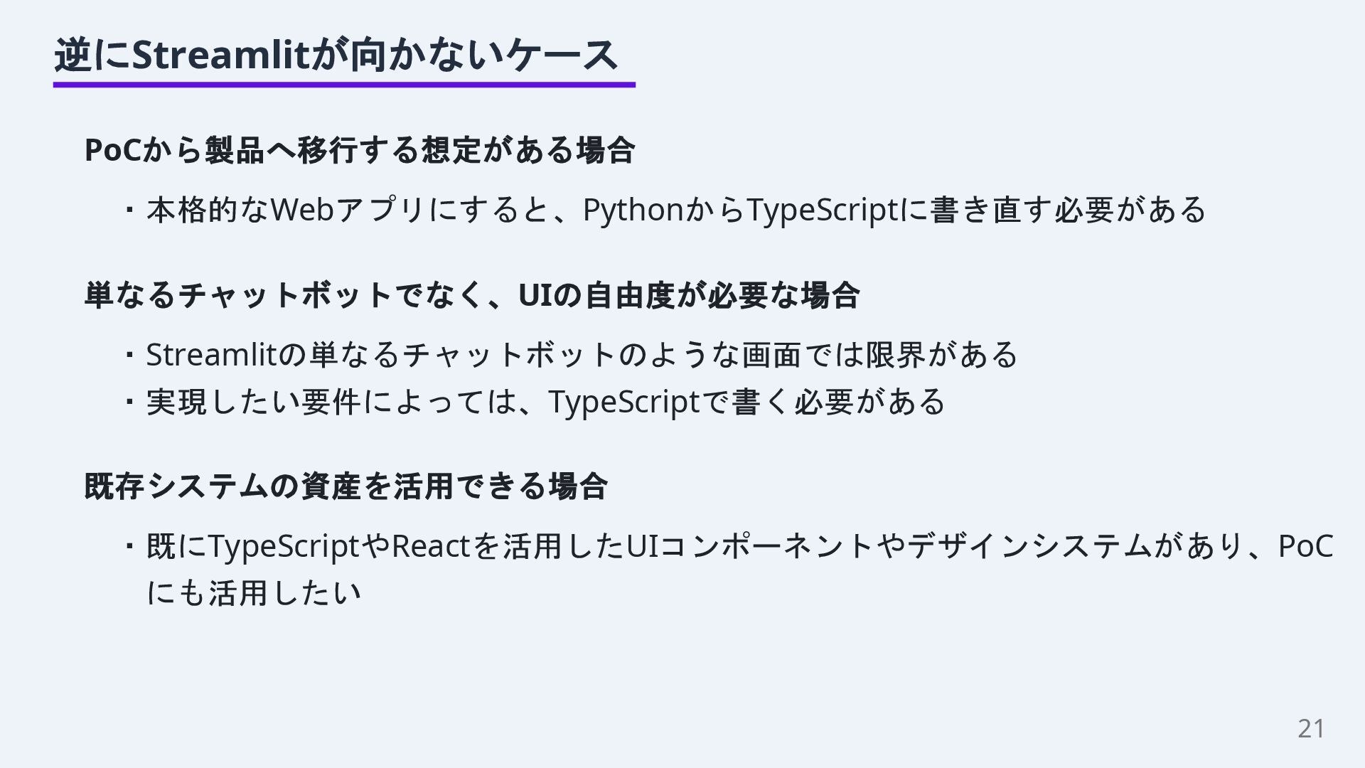 PoCから製品へ移行する想定がある場合 ・本格的なWebアプリにすると、PythonからTypeScriptに書き直す必要がある 単なるチャットボットでなく、UIの自由度が必要な場合 ・Streamlitの単なるチャットボットのような画面では限界がある ・実現したい要件によっては、TypeScriptで書く必要がある 既存システムの資産を活用できる場合 ・既にTypeScriptやReactを活用したUIコンポーネントやデザインシステムがあり、PoC にも活用したい 逆にStreamlitが向かないケース 21