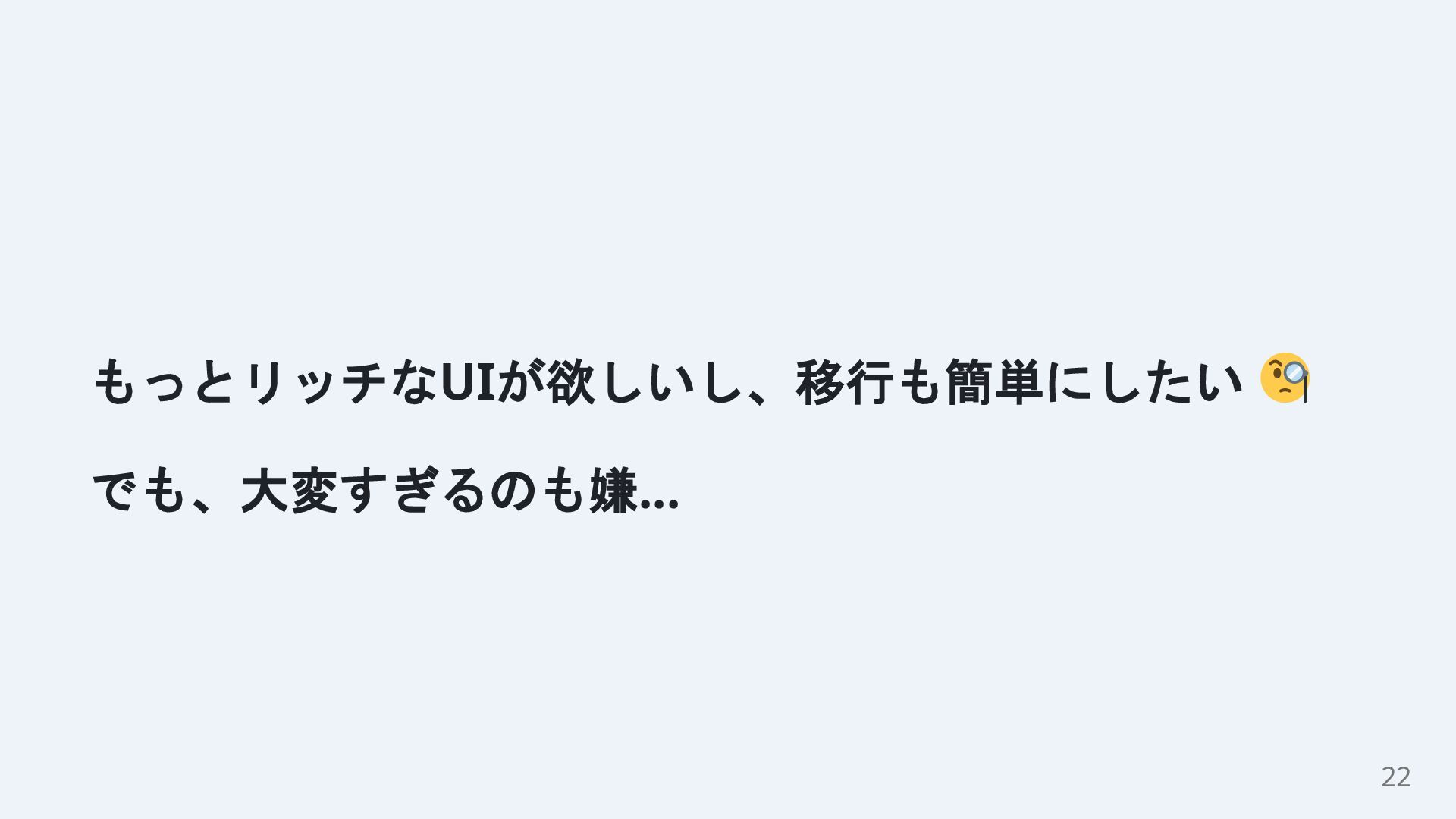 もっとリッチなUIが欲しいし、移行も簡単にしたい でも、大変すぎるのも嫌... 22