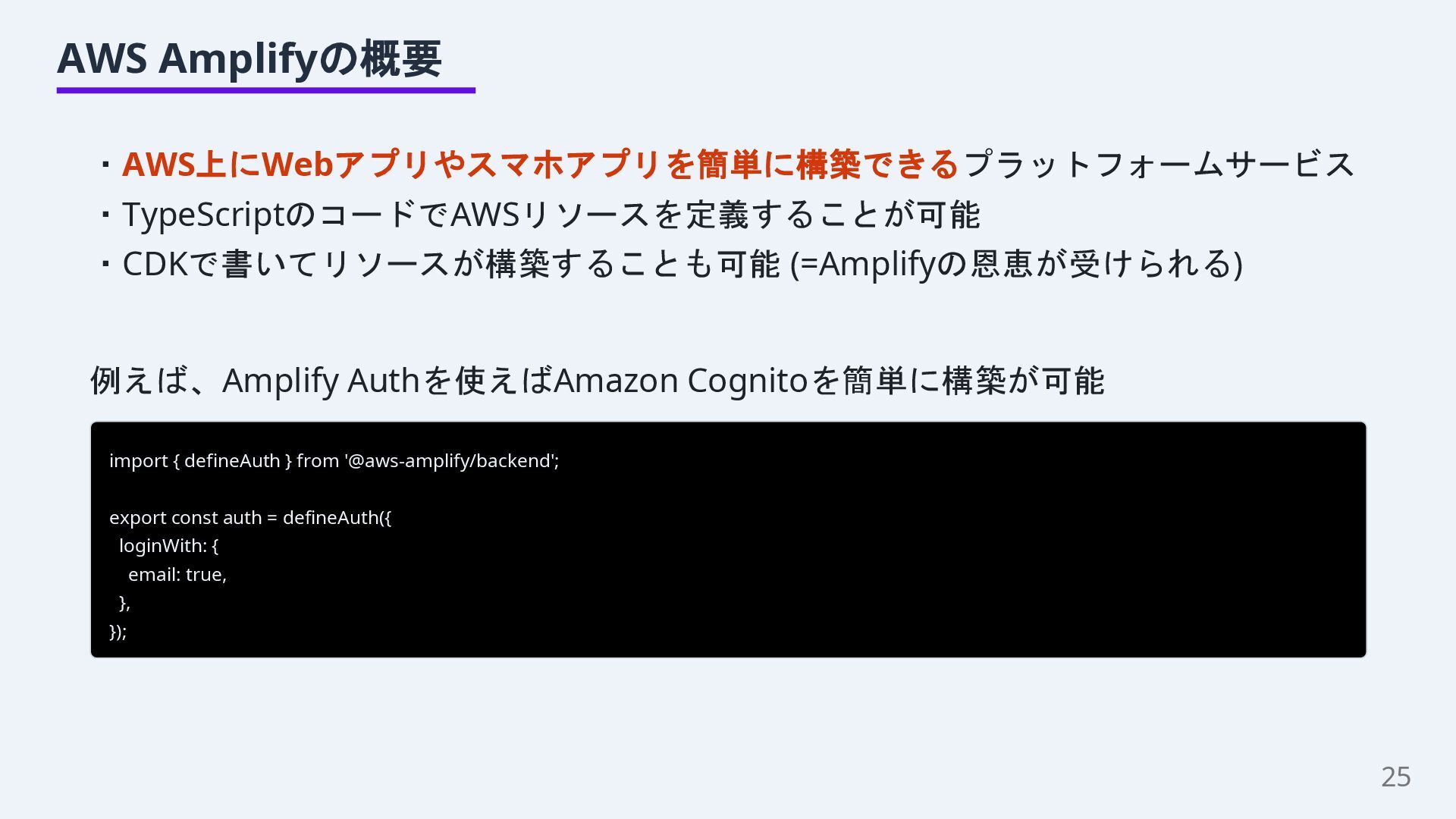 ・AWS上にWebアプリやスマホアプリを簡単に構築できるプラットフォームサービス ・TypeScriptのコードでAWSリソースを定義することが可能 ・CDKで書いてリソースが構築することも可能 (=Amplifyの恩恵が受けられる) 例えば、Amplify Authを使えばAmazon Cognitoを簡単に構築が可能 import { defineAuth