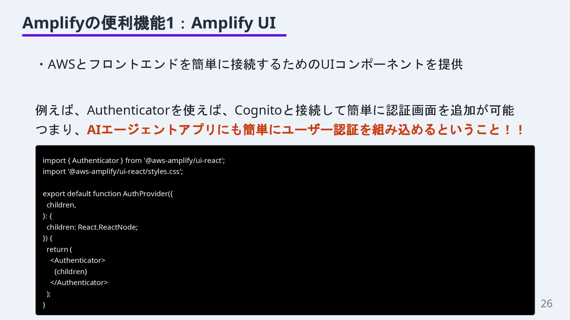 ・AWSとフロントエンドを簡単に接続するためのUIコンポーネントを提供 例えば、Authenticatorを使えば、Cognitoと接続して簡単に認証画面を追加が可能 つまり、AIエージェントアプリにも簡単にユーザー認証を組み込めるということ!! import { Authenticator } from '@aws-amplify/ui-react'; import