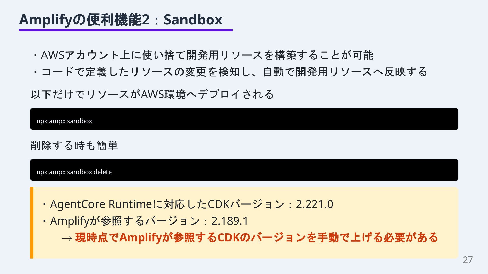 delete ・AgentCore Runtimeに対応したCDKバージョン:2.221.0 ・Amplifyが参照するバージョン:2.189.1 → 現時点でAmplifyが参照するCDKのバージョンを手動で上げる必要がある Amplifyの便利機能2:Sandbox 27