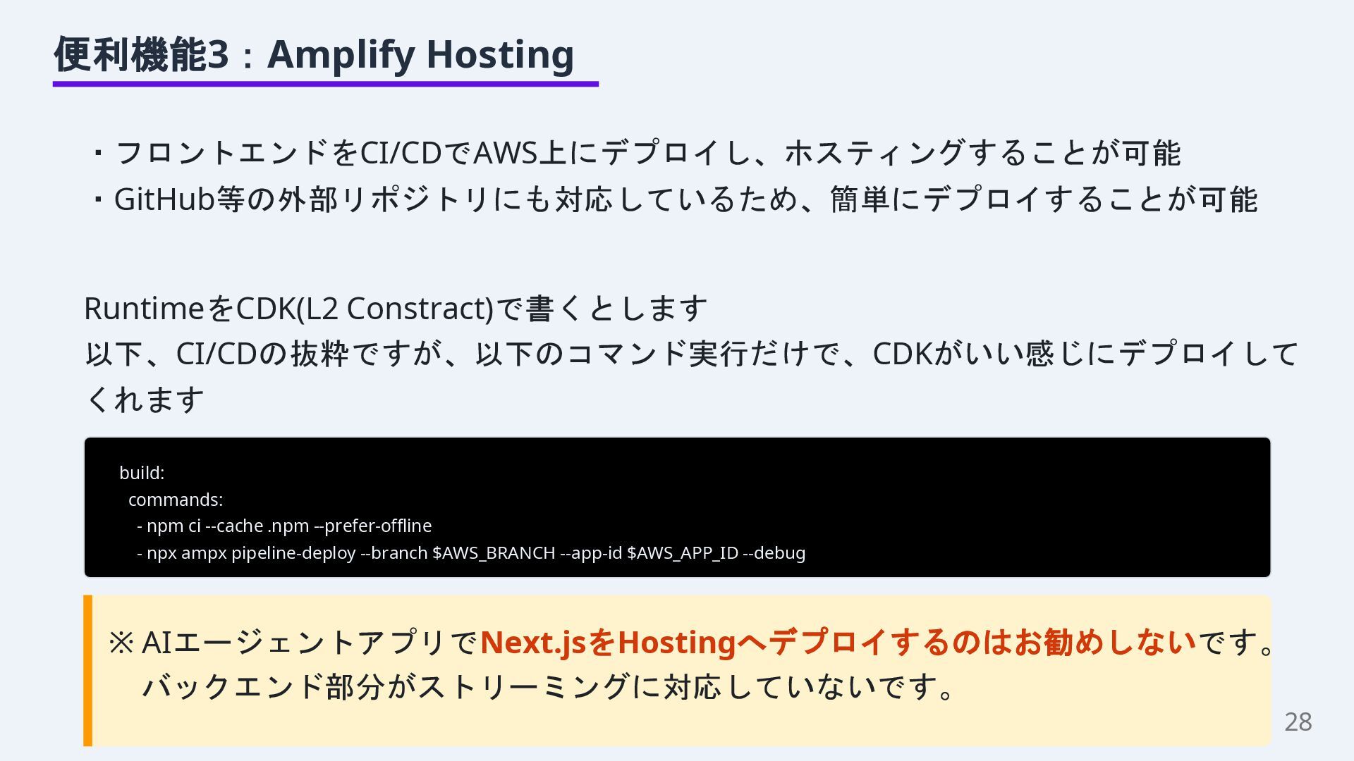 ci --cache .npm --prefer-offline - npx ampx pipeline-deploy --branch $AWS_BRANCH --app-id $AWS_APP_ID --debug ※ AIエージェントアプリでNext.jsをHostingへデプロイするのはお勧めしないです。 バックエンド部分がストリーミングに対応していないです。 便利機能3:Amplify Hosting 28