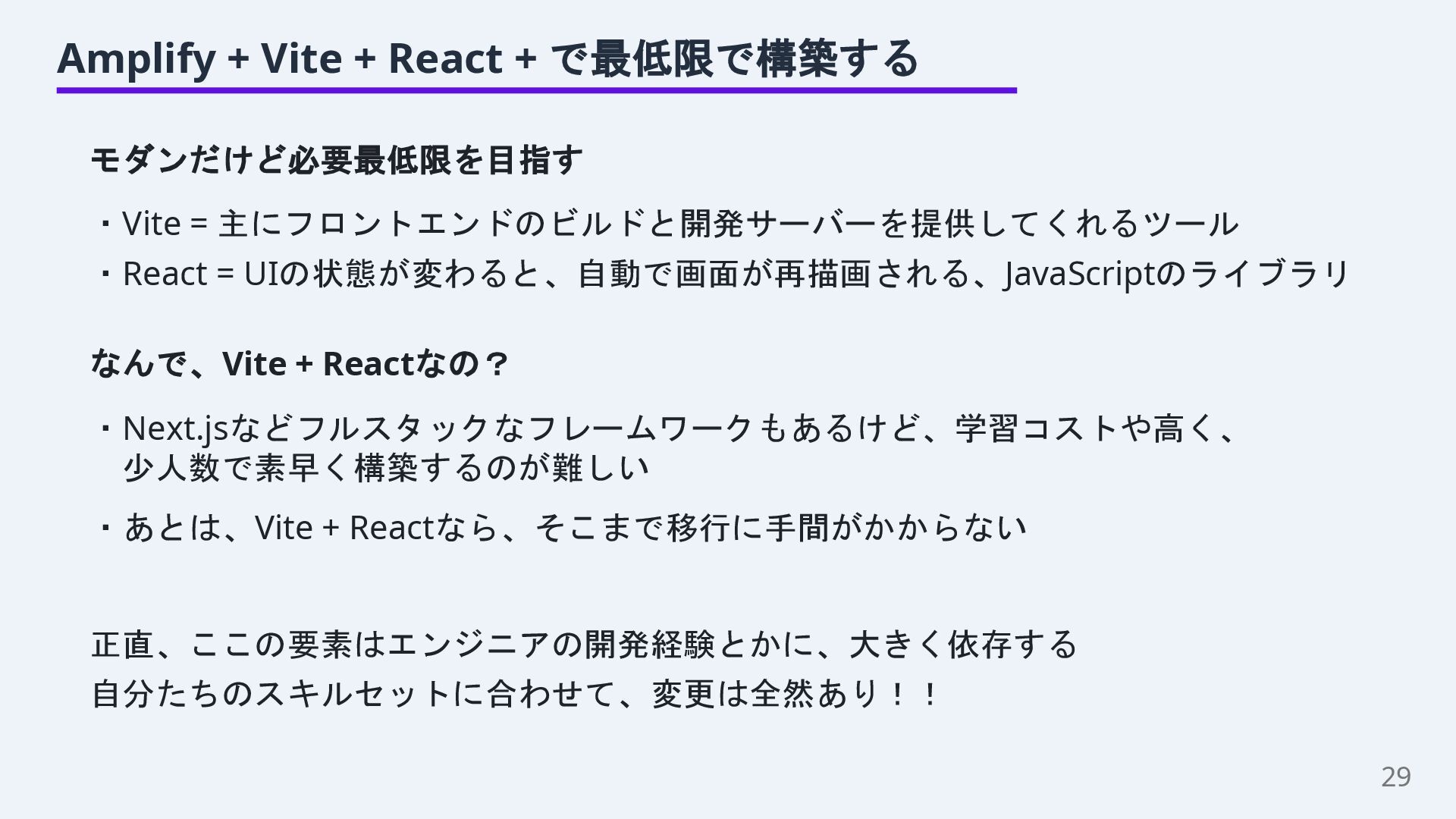 ・Next.jsなどフルスタックなフレームワークもあるけど、学習コストや高く、 少人数で素早く構築するのが難しい ・あとは、Vite + Reactなら、そこまで移行に手間がかからない 正直、ここの要素はエンジニアの開発経験とかに、大きく依存する 自分たちのスキルセットに合わせて、変更は全然あり!! Amplify + Vite + React + で最低限で構築する 29